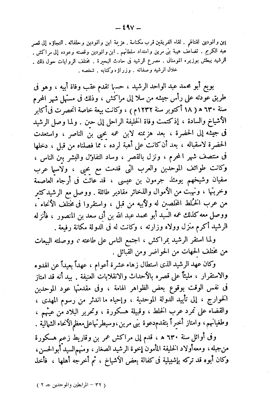 ابن وانودين لقتالهم. لقاء الفريقين قرب مكناسة. هزيمة ابن وانودين وحلفائه. التجاؤه إلى قصر عبد الكريم. تضاعف هيبة بني مرين وامتداد سلطانهم. ابن وانودين وقصته وعوده إلى مراكش. الرشيد يبطش بوزيره المومنانى. مصرع الرشيد في حادث البحيرة. مختلف الروايات حول ذلك. خلال الرشيد وصفاته. وزراؤه وكتابه. شخصه.