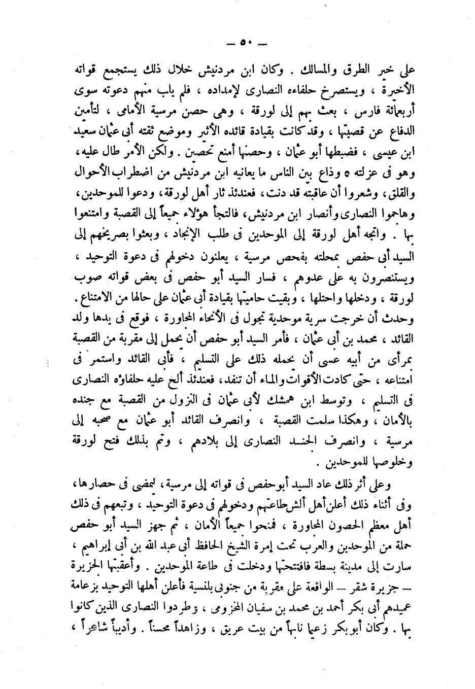 على خير الطرق والمسالك. وكان ابن مردنيش خلال ذلك يستجمع قواته الأخيرة، ويستصرخ حلفاءه النصارى لإمداده، فلم يلب منهم دعوته سوى أربعمائة فارس، بعث بهم إلى لورقة، وهي حصن مرسية الأمامي، لتأمين الدفاع عن قصبتها، وقد كانت بقيادة قائده الأثير وموضع ثقته أبي عثمان سعيد ابن عيسى، فضبطها أبو عثمان، وحصنها أمنع تحصين. ولكن الأمر طال عليه، وهو في عزلته، وذاع بين الناس ما يعانيه ابن مردنيش من اضطراب الأحوال والقلق، وشعروا أن عاقبته قد دنت، فعندئذ ثار أهل لورقة، ودعوا للموحدين، وهاجموا النصارى وأنصار ابن مردنيش، فالتجأ هؤلاء جميعاً إلى القصبة وامتنعوا بها. واتجه أهل لورقة إلى الموحدين في طلب الإنجاد، وبعثوا بصريخهم إلى السيد أبي حفص بمحلته بفحص مرسية، يعلنون دخولهم في دعوة التوحيد، ويستنصرون به على عدوهم، فسار السيد أبو حفص في بعض قواته صوب لورقة، ودخلها واحتلها، وبقيت حاميتها بقيادة أبي عثمان على حالها من الامتناع.