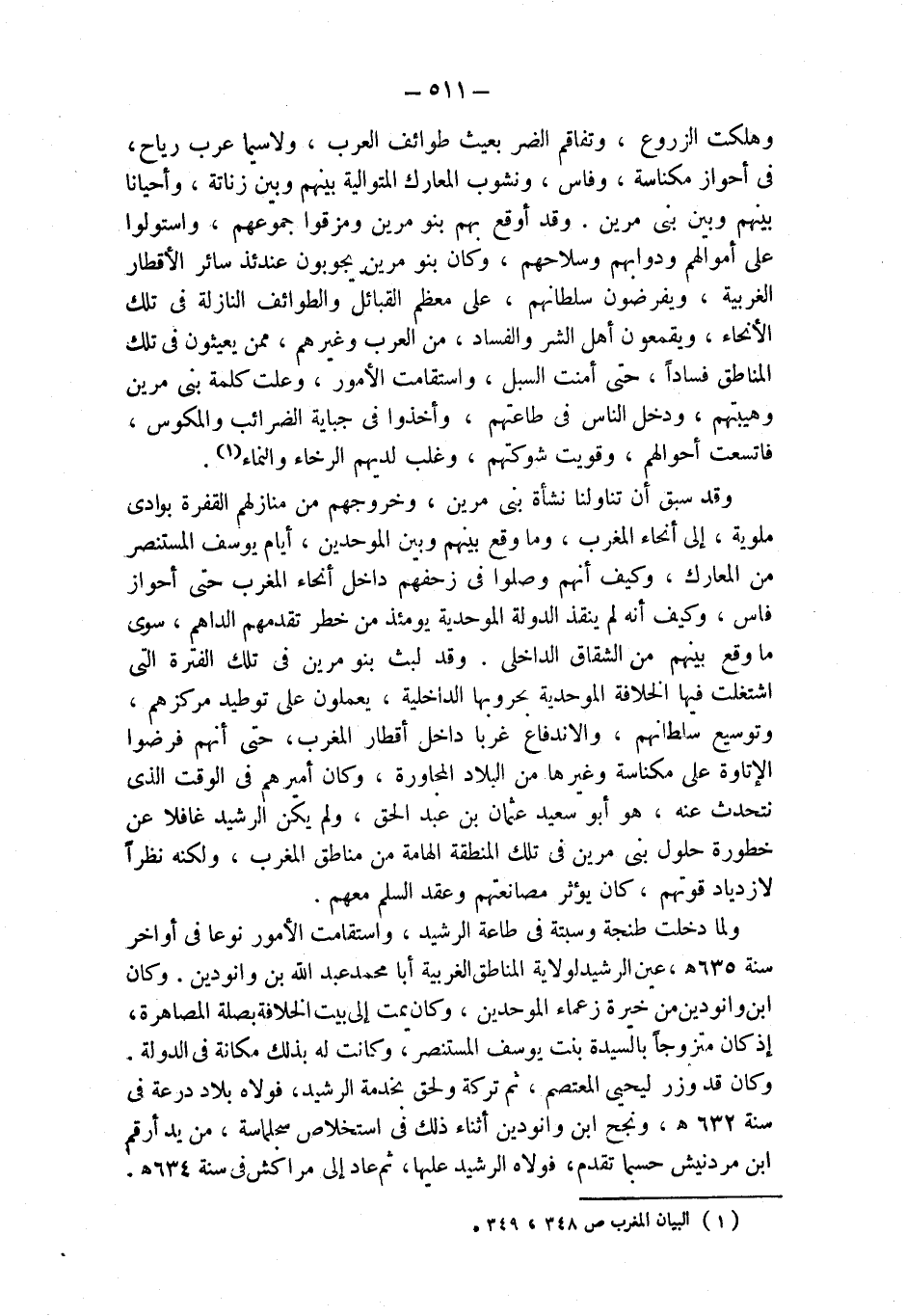 وهلكت الزروع، وتفاقم الضر بعيث طوائف العرب، ولاسيما عرب رياح، في أحواز مكناسة، وفاس، ونشوب المعارك المتوالية بينهم وبين زناتة، وأحيانا بينهم وبين بني مرين. وقد أوقع بهم بنو مرين ومزقوا جموعهم، واستولوا على أموالهم ودوابهم وسلاحهم، وكان بنو مرين يجوبون عندئذ سائر الأقطار الغربية، ويفرضون سلطانهم، على معظم القبائل والطوائف النازلة في تلك الأنحاء، ويقمعون أهل الشر والفساد، من العرب وغيرهم، ممن يعيثون في تلك المناطق فساداً، حتى أمنت السبل، واستقامت الأمور، وعلت كلمة بني مرين وهيبتهم، ودخل الناس في طاعتهم، وأخذوا في جباية الضرائب والمكوس، فاتسعت أحوالهم، وقويت شوكتهم، وغلب لديهم الرخاء والنماء (¬1).