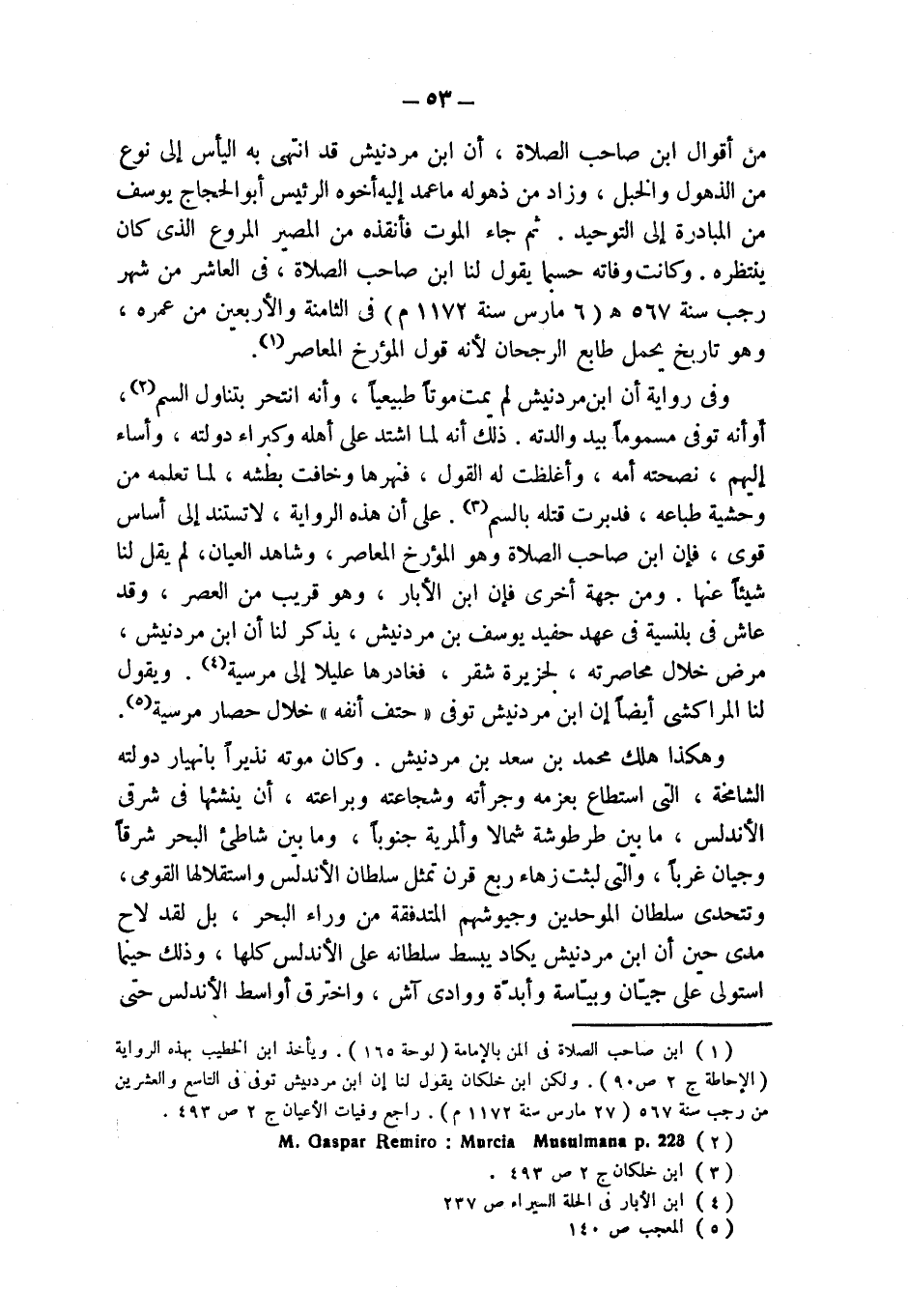 (¬1) ابن صاحب الصلاة في المن بالإمامة (لوحة 165). ويأخذ ابن الخطيب بهذه الرواية (الإحاطة ج 2 ص 90). ولكن ابن خلكان يقول لنا إن ابن مردنيش توفي في التاسع والعشرين من رجب سنة 567 هـ (27 مارس سنة 1172 م). راجع وفيات الأعيان ج 2 ص 493.