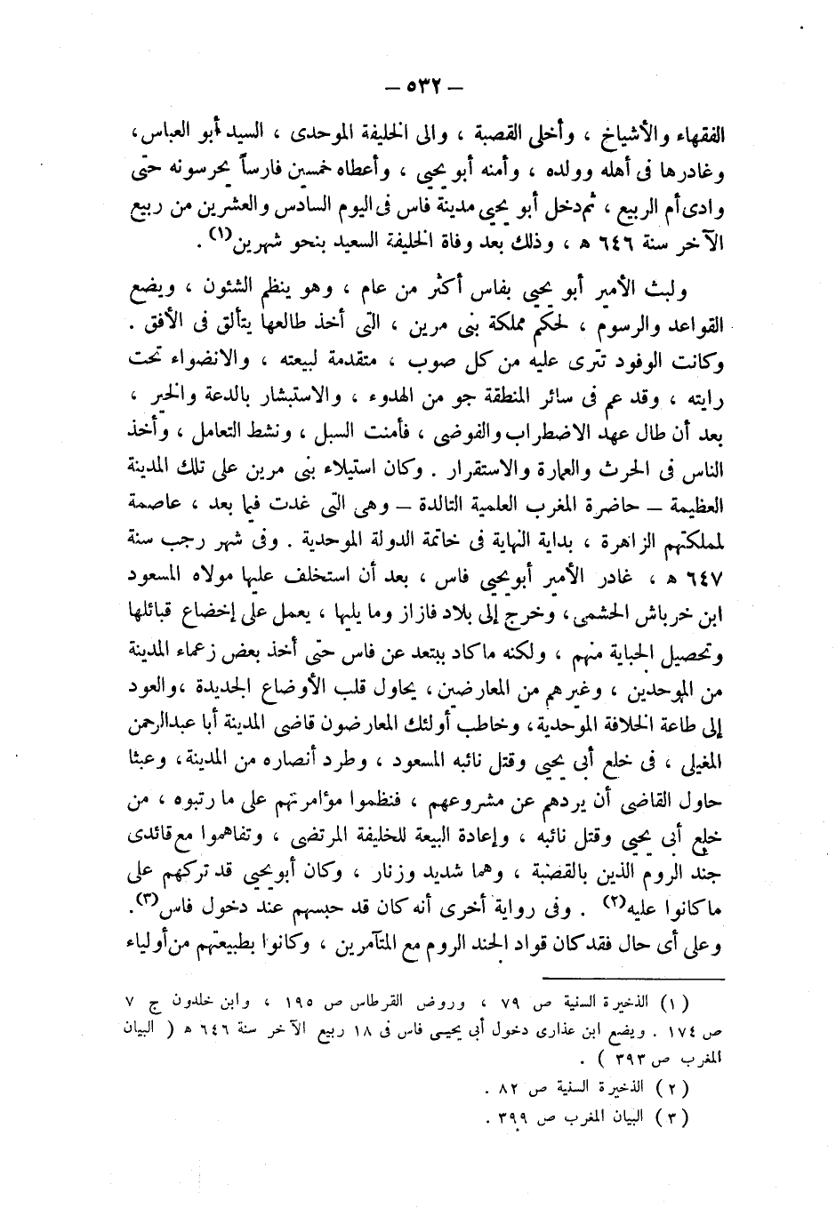 (¬1) الذخيرة السنية ص 79، وروض القرطاس ص 195، وابن خلدون ج 7 ص 174. ويضع ابن عذارى دخول أبي يحيى فاس في 18 ربيع الآخر سنة 646 هـ (البيان المغرب ص 393).