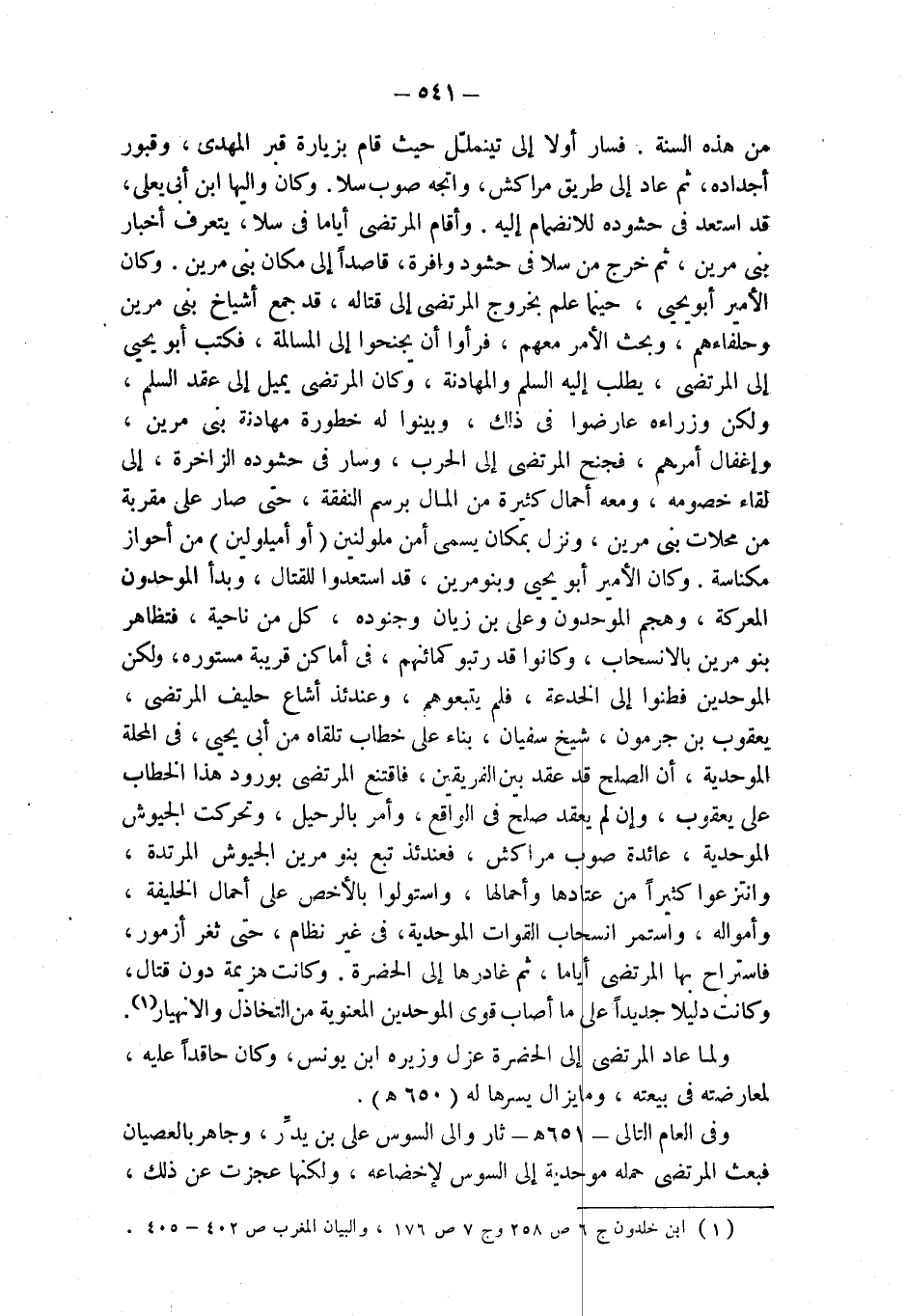 من هذه السنة. فسار أولا إلى تينملّل حيث قام بزيارة قبر المهدي، وقبور أجداده، ثم عاد إلى طريق مراكش، واتجه صوب سلا. وكان واليها ابن أبي يعلى، قد استعد في حشوده للانضمام إليه. وأقام المرتضى أياما في سلا، يتعرف أخبار بني مرين، ثم خرج من سلا في حشود وافرة، قاصداً إلى مكان بني مرين. وكان الأمير أبو يحيى، حينما علم بخروج المرتضى إلى قتاله، قد جمع أشياخ بني مرين وحلفاءهم، وبحث الأمر معهم، فرأوا أن يجنحوا إلى المسالمة، فكتب أبو يحيى إلى المرتضى، يطلب إليه السلم والمهادنة، وكان المرتضى يميل إلى عقد السلم، ولكن وزراءه عارضوا في ذلك، وبينوا له خطورة مهادنة بني مرين، وإغفال أمرهم، فجنح المرتضى إلى الحرب، وسار في حشوده الزاخرة، إلى لقاء خصومه، ومعه أحمال كثيرة من المال برسم النفقة، حتى صار على مقربة من محلات بني مرين، ونزل بمكان يسمى أمن ملولنين (أو أميلولين) من أحواز مكناسة. وكان الأمير أبو يحيى وبنو مرين، قد استعدوا للقتال، وبدأ الموحدون المعركة، وهجم الموحدون وعلي بن زيان وجنوده، كل من ناحية، فتظاهر بنو مرين بالانسحاب، وكانوا قد رتبوا كمائنهم، في أماكن قريبة مستورة، ولكن الموحدين فطنوا إلى الخدعة، فلم يتبعوهم، وعندئذ أشاع حليف المرتضى، يعقوب بن جرمون، شيخ سفيان، بناء على خطاب تلقاه من أبي يحيى، في المحلة الموحدية، أن الصلح قد عقد بين الفريقين، فاقتنع المرتضى بورود هذا الخطاب على يعقوب، وإن لم يعقد صلح في الواقع، وأمر بالرحيل، وتحركت الجيوش الموحدية، عائدة صوب مراكش، فعندئذ تبع بنو مرين الجيوش المرتدة، وانتزعوا كثيراً من عتادها وأحمالها، واستولوا بالأخص على أحمال الخليفة وأمواله، واستمر انسحاب القوات الموحدية، في غير نظام، حتى ثغر أزمور، فاستراح بها المرتضى أياما، ثم غادرها إلى الحضرة. وكانت هزيمة دون قتال، وكانت دليلا جديداً على ما أصاب قوي الموحدين المعنوية من التخاذل والانهيار (¬1).
