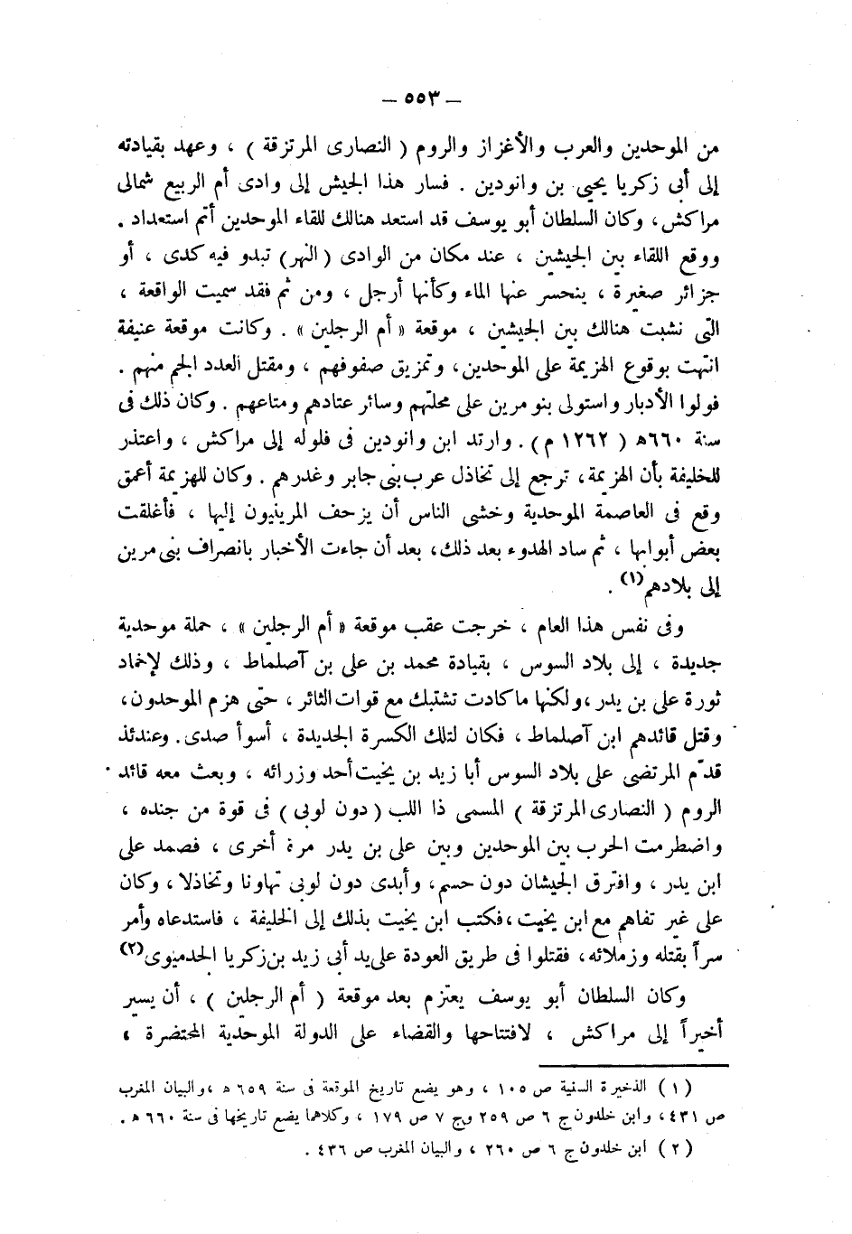 (¬1) الذخيرة السنية ص 105، وهو يضع تاريخ الموقعة في سنة 659 هـ، والبيان المغرب ص 431، وابن خلدون ج 6 ص 259 وج 7 ص 179، وكلاهما يضع تاريخها في سنة 660 هـ.