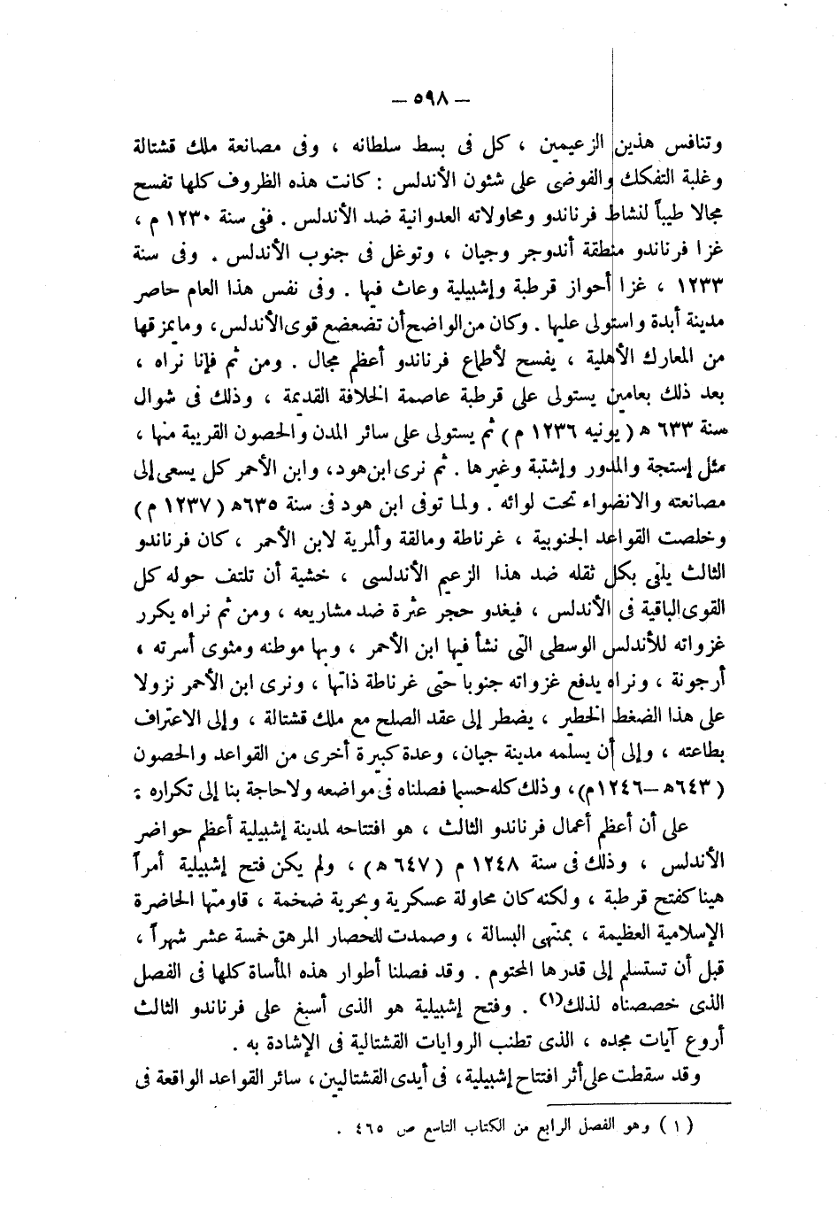 وتنافس هذين الزعيمين، كل في بسط سلطانه، وفي مصانعة ملك قشتالة وغلبة التفكك والفوضى على شئون الأندلس: كانت هذه الظروف كلها تفسح مجالاً طيباً لنشاط فرناندو ومحاولاته العدوانية ضد الأندلس. ففي سنة 1230 م، غزا فرناندو منطقة أندوجر وجيان، وتوغل في جنوب الأندلس. وفي سنة 1233، غزا أحواز قرطبة وإشبيلية وعاث فيها. وفي نفس هذا العام حاصر مدينة أبدة واستولى عليها. وكان من الواضح أن تضعضع قوي الأندلس، وما يمزقها من المعارك الأهلية، يفسح لأطماع فرناندو أعظم مجال. ومن ثم فإنا نراه، بعد ذلك بعامين يستولي على قرطبة عاصمة الخلافة القديمة، وذلك في شوال سنة 633 هـ (يونيه 1236 م) ثم يستولي على سائر المدن والحصون القريبة منها، مثل إستجة والمدور وإشتبة وغيرها. ثم نرى ابن هود، وابن الأحمر كل يسعى إلى مصانعته والانضواء تحت لوائه. ولما توفي ابن هود في سنة 635 هـ (1237 م) وخلصت القواعد الجنوبية، غرناطة ومالقة وألمرية لابن الأحمر، كان فرناندو الثالث يلقى بكل ثقله ضد هذا الزعيم الأندلسي، خشية أن تلتف حوله كل القوي الباقية في الأندلس، فيغدو حجر عثرة ضد مشاريعه، ومن ثم نراه يكرر غزواته للأندلس الوسطى التي نشأ فيها ابن الأحمر، وبها موطنه ومثوى أسرته، أرجونة، ونراه يدفع غزواته جنوبا حتى غرناطة ذاتها، ونرى ابن الأحمر نزولا على هذا الضغط الخطير، يضطر إلى عقد الصلح مع ملك قشتالة، وإلى الاعتراف بطاعته، وإلى أن يسلمه مدينة جيان، وعدة كبيرة أخرى من القواعد والحصون (643 هـ - 1246 م)، وذلك كله حسبما فصلناه في مواضعه ولا حاجة بنا إلى تكراره. على أن أعظم أعمال فرناندو الثالث، هو افتتاحه لمدينة إشبيلية أعظم حواضر الأندلس، وذلك في سنة 1248 م (646 هـ)، ولم يكن فتح إشبيلية أمراً هيناً كفتح قرطبة، ولكنه كان محاولة عسكرية وبحرية ضخمة، قاومتها الحاضرة الإسلامية العظيمة، بمنتهى البسالة، وصمدت للحصار المرهق خمسة عشر شهراً، قبل أن تستسلم إلى قدرها المحتوم. وقد فصلنا أطوار هذه المأساة كلها في الفصل الذي خصصناه لذلك (¬1). وفتح إشبيلية هو الذي أسبغ على فرناندو الثالث أروع آيات مجده، الذي تطنب الروايات القشتالية في الإشادة به.