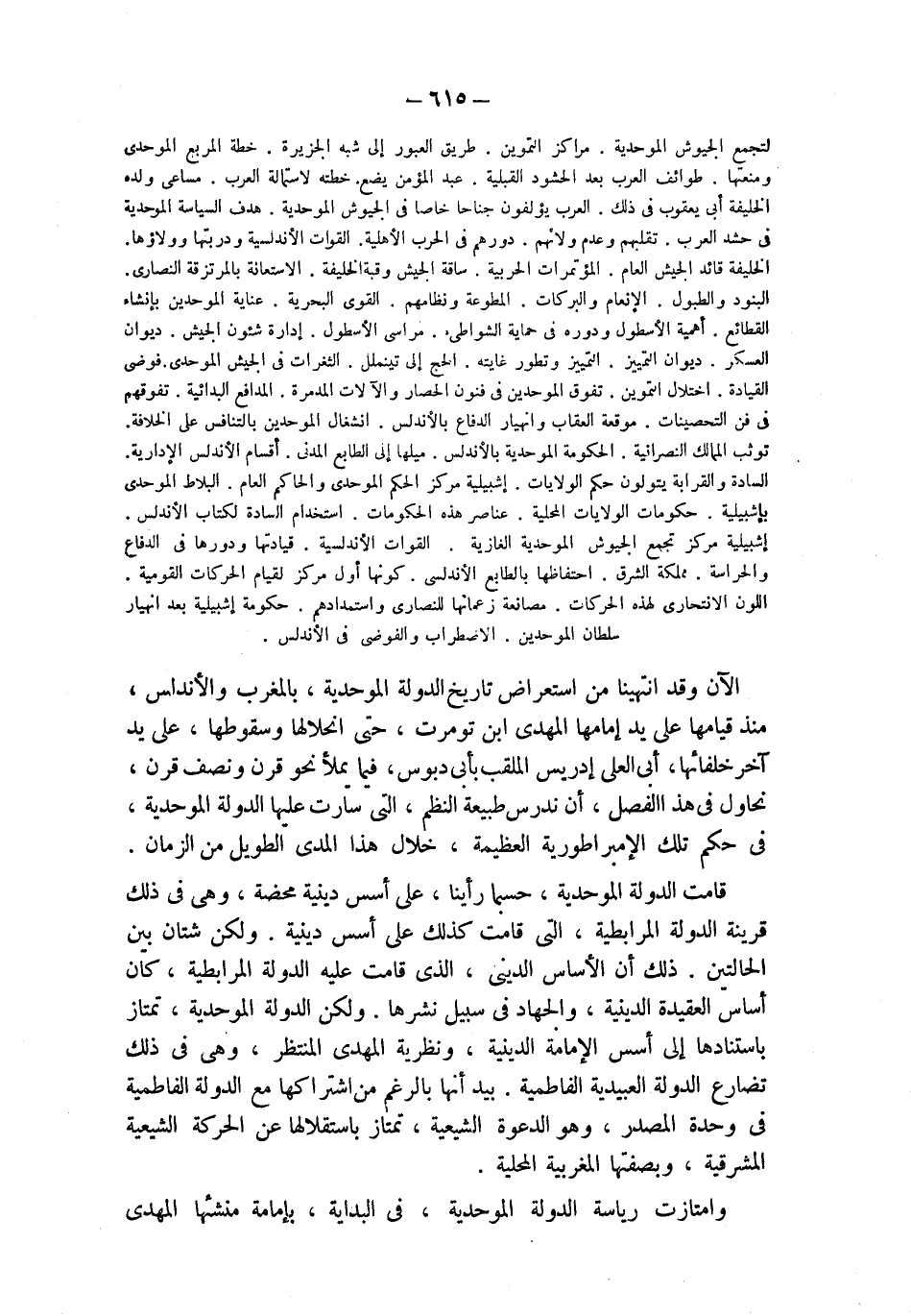 لتجمع الجيوش الموحدية. مراكز التموين. طريق العبور إلى شبه الجزيرة. خطة المربع الموحدي ومنعتها. طوائف العرب بعد الحشود القبلية. عبد المؤمن يضع خطته لاستمالة العرب. مساعى ولده الخليفة أبي يعقوب في ذلك. العرب يؤلفون جناحا خاصا في الجيوش الموحدية. هدف السياسة الموحدية في حشد العرب. تقلبهم وعدم ولائهم. دورهم في الحرب الأهلية. القوات الأندلسية ودربتها وولاؤها. الخليفة قائد الجيش العام. المؤتمرات الحربية. ساقة الجيش وقبة الخليفة. الاستعانة بالمرتزقة النصارى. البنود والطبول. الإنعام والبركات. المطوعة ونظامهم. القوي البحرية. عناية الموحدين بإنشاء القطائع. أهمية الأسطول ودوره في حماية الشواطىء. مراسى الأسطول. إدارة شئون الجيش. ديوان العسكر. ديوان التمييز. التمييز وتطور غايته. الحج إلى تينملل. الثغرات في الجيش الموحدي. فوضى القيادة. اختلال التموين. تفوق الموحدين في فنون الحصار والآلات المدمرة. المدافع البدائية. تفوقهم في فن التحصينات. موقعة العقاب وانهيار الدفاع بالأندلس. انشغال الموحدين بالتنافس على الخلافة. توثب الممالك النصرانية. الحكومة الموحدية بالأندلس. ميلها إلى الطابع المدنى. أقسام الأندلس الإدارية. السادة والقرابة يتولون حكم الولايات. إشبيلية مركز الحكم الموحدي والحاكم العام. البلاط الموحدي بإشبيلية. حكومات الولايات المحلية. عناصر هذه الحكومات. استخدام السادة لكتاب الأندلس. إشبيلية مركز تجمع الجيوش المحلية الغازية. القوات الأندلسية. قيادتها ودورها في الدفاع والحراسة. مملكة الشرق. احتفاظها بالطابع الأندلسي. كونها أول مركز لقيام الحركات القومية. اللون الانتحارى لهذه الحركات. مصانعة زعمائها للنصارى واستمدادهم. حكومة إشبيلية بعد انهيار سلطان الموحدين. الاضطراب والفوضى في الأندلس.