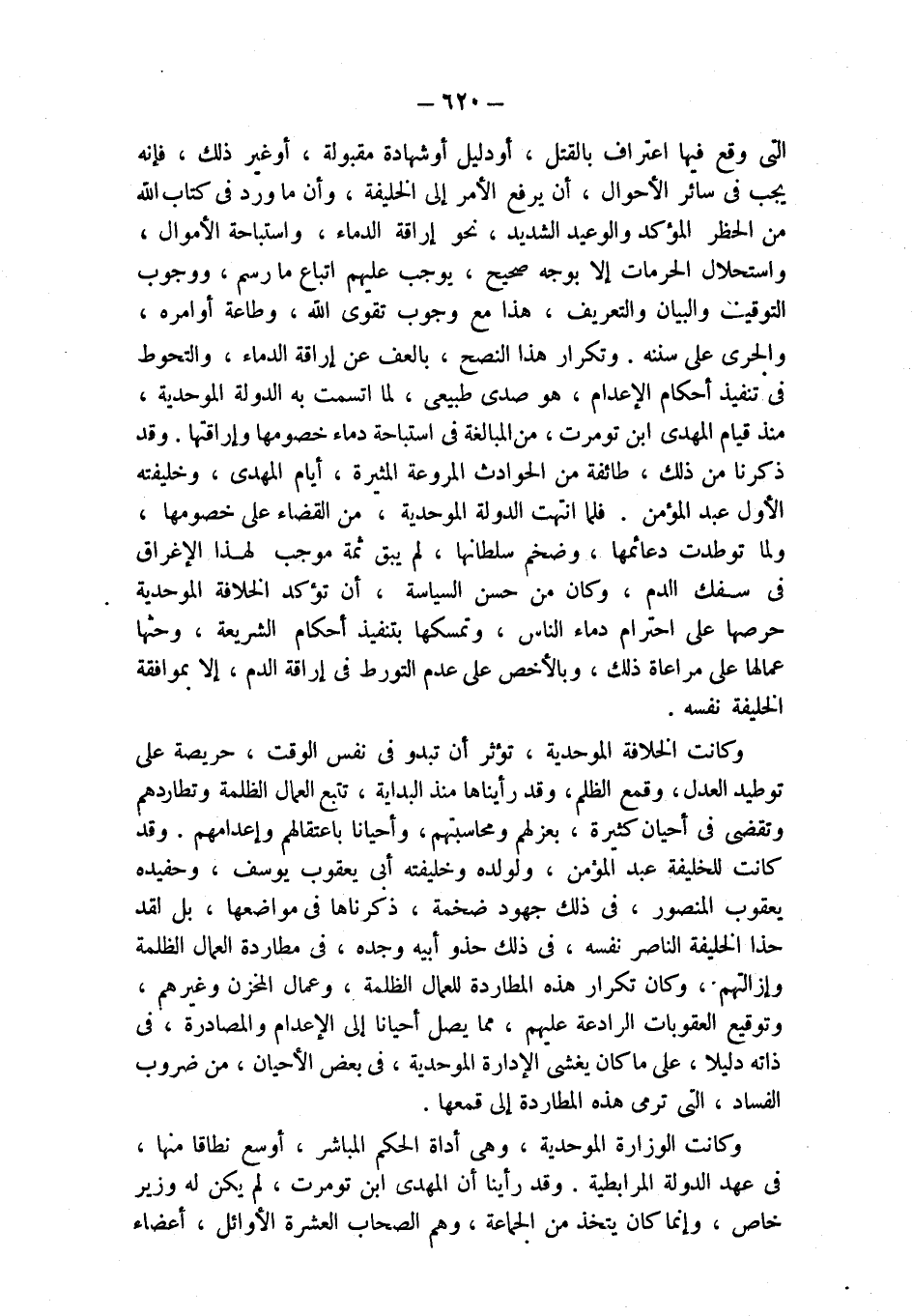 التي وقع فيها اعتراف بالقتل، أو دليل أو شهادة مقبولة، أو غير ذلك، فإنه يجب في سائر الأحوال، أن يرفع الأمر إلى الخليفة، وأن ما ورد في كتاب الله من الحظر المؤكد والوعيد الشديد، نحو إراقة الدماء، واستباحة الأموال، واستحلال الحرمات إلا بوجه صحيح، يوجب عليهم اتباع ما رسم، ووجوب التوقين والبيان والتعريف، هذا مع وجوب تقوى الله، وطاعة أوامره، والجرى على سننه. وتكرار هذا النصح، بالعف عن إراقة الدماء، والتحوط في تنفيذ أحكام الإعدام، هو صدى طبيعى، لما اتسمت به الدولة الموحدية، منذ قيام المهدي ابن تومرت، من المبالغة في استباحة دماء خصومها وإراقتها. وقد ذكرنا من ذلك، طائفة من الحوادث المروعة المثيرة، أيام المهدي، وخليفته الأول عبد المؤمن. فلما انتهت الدولة الموحدية، من القضاء على خصومها، ولما توطدت دعائمها، وضخم سلطانها، لم يبق ثمة موجب لهذا الإغراق في سفك الدم، وكان من حسن السياسة، أن تؤكد الخلافة الموحدية حرصها على احترام دماء الناس، وتمسكها بتنفيذ أحكام الشريعة، وحثها عمالها على مراعاة ذلك، وبالأخص على عدم التورط في إراقة الدم، إلا بموافقة الخليفة نفسه.