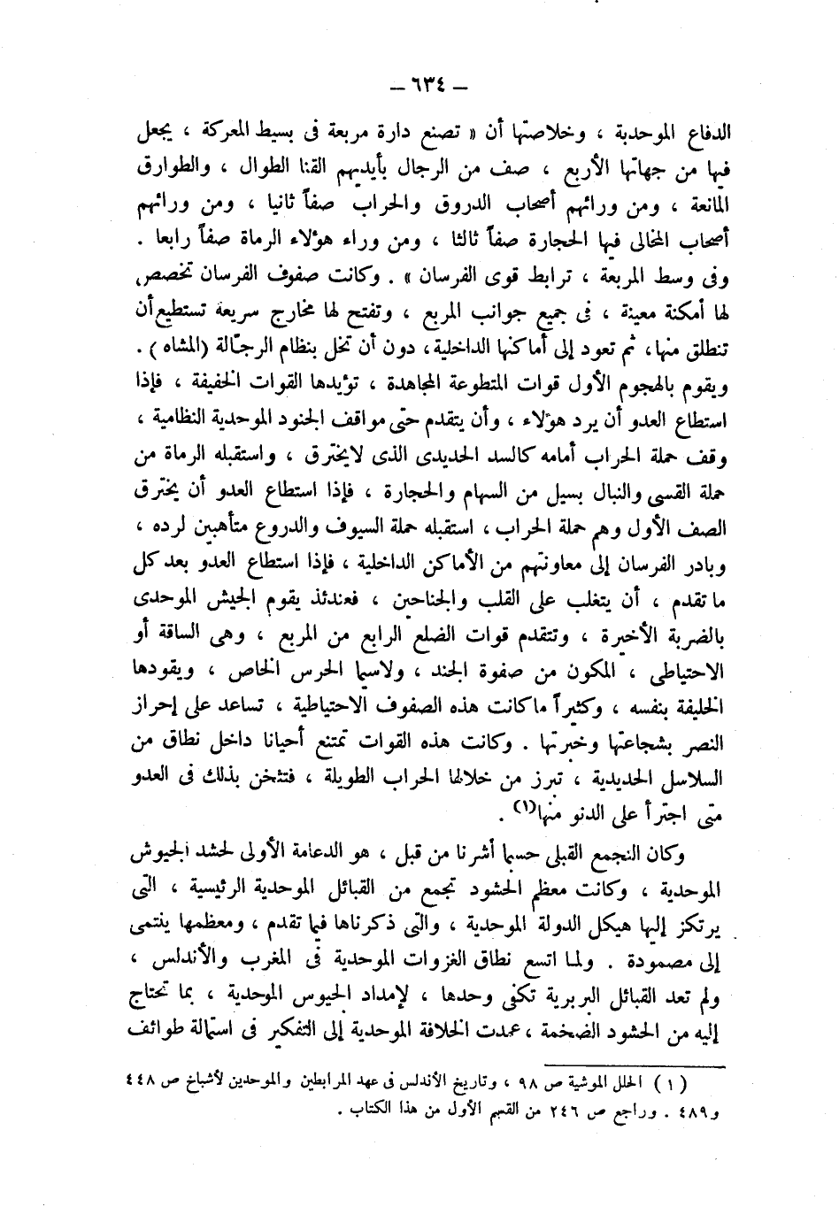 الدفاع الموحدية، وخلاصتها أن " تصنع دارة مربعة في بسيط المعركة، يجعل فيها من جهاتها الأربع، صف من الرجال بأيديهم القنا الطوال، والطوارق المانعة، ومن ورائهم أصحاب الدروق والحراب صفاً ثانياً، ومن ورائهم أصحاب المخالى فيها الحجارة صفاً ثالثاً، ومن وراء هؤلاء الرماة صفاً رابعاً. وفي وسط المربعة، ترابط قوي الفرسان ". وكانت صفوف الفرسان تخصص لها أمكنة معينة، في جميع جوانب المربع، وتفتح لها مخارج سريعة تستطيع أن تنطلق منها، ثم تعود إلى أماكنها الداخلية، دون أن تخل بنظام الرجّالة (المشاة). ويقوم بالهجوم الأول قوات المتطوعة المجاهدة، تؤيدها القوات الخفيفة، فإذا استطاع العدو أن يرد هؤلاء، وأن يتقدم حتى مواقف الجنود الموحدية النظامية، وقف حملة الحراب أمامه كالسد الحديدى الذي لا يخترق، واستقبله الرماة من حملة القسى والنبال بسيل من السهام والحجارة، فإذا استطاع العدو أن يخترق الصف الأول وهم حملة الحراب، استقبله حملة السيوف والدروع متأهبين لرده، وبادر الفرسان إلى معاونتهم من الأماكن الداخلية، فإذا استطاع العدو بعد كل ما تقدم، أن يتغلب على القلب والجناحين، فعندئذ يقوم الجيش الموحدي بالضربة الأخيرة، وتتقدم قوات الضلع الرابع من المربع، وهي الساقة أو الاحتياطى، المكون من صفوة الجند، ولاسيما الحرس الخاص، ويقودها الخليفة بنفسه، وكثيراً ما كانت هذه الصفوف الاحتياطية، تساعد على إحراز النصر بشجاعتها وخبرتها. وكانت هذه القوات تمتنع أحيانا داخل نطاق من السلاسل الحديدية، تبرز من خلالها الحراب الطويلة، فتثخن بذلك في العدو متى اجترأ على الدنو منها (¬1).