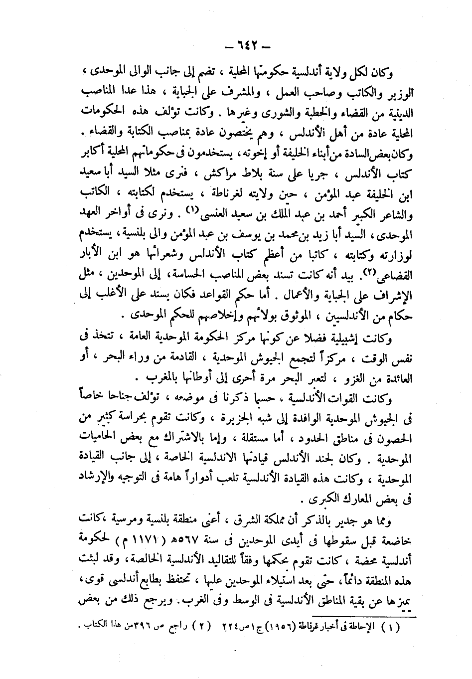 وكان لكل ولاية أندلسية حكومتها المحلية، تضم إلى جانب الوالي الموحدي، الوزير والكاتب وصاحب العمل، والمشرف على الجباية، هذا عدا المناصب الدينية من القضاء والخطبة والشورى وغيرها. وكانت تؤلف هذه الحكومات المحلية عادة من أهل الأندلس، وهم يختصون عادة بمناصب الكتابة والقضاء. وكان بعض السادة من أبناء الخليفة أو إخوته، يستخدمون في حكوماتهم المحلية أكابر كتاب الأندلس، جريا على سنة بلاط مراكش، فنرى مثلا السيد أبا سعيد ابن الخليفة عبد المؤمن، حين ولايته لغرناطة، يستخدم لكتابته، الكاتب والشاعر الكبير أحمد بن عبد الملك بن سعيد العنسى (¬1). ونرى في أواخر العهد الموحدي، السيد أبا زيد بن محمد بن يوسف بن عبد المؤمن والي بلنسية، يستخدم لوزارته وكتابته، كاتبا من أعظم كتاب الأندلس وشعرائها هو ابن الأبار القضاعى (¬2). بيد أنه كانت تسند بعض المناصب الحساسة، إلى الموحدين، مثل الإشراف على الجباية والأعمال. أما حكم القواعد فكان يسند على الأغلب إلى حكام من الأندلسيين، الموثوق بولائهم وإخلاصهم للحكم الموحدي.