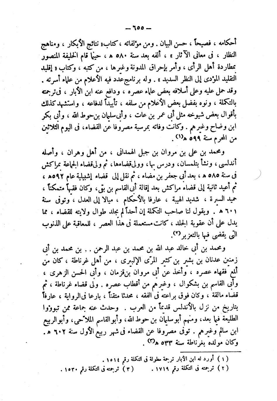 أحكامه، فصيحاً، حسن البيان. ومن مؤلفاته، كتاب " نتائج الأبكار، ومناهج النظار، في معانى الآثار "، ألفه بعد سنة 580 هـ، حينما قام الخليفة المنصور بمطاردة أهل الرأي، وأمر بإحراق المدونة وغيرها، من كتبه، وكتاب " إقليد التقليد المؤدى إلى النظر السديد ". وله برنامج عدد فيه الأعلام من علماء أسرته. وقد حمل عليه وعلى أسلافه بعض علماء عصره، ودافع عنه ابن الأبار، في ترجمته بالتكملة، ونوه بفضل بعض الأعلام من سلفه، تأييداً لدفاعه، واستشهد كذلك بأقوال بعض شيوخه مثل أبي عمر بن عات، وأبي سليمان بن حوط الله، وأبي بكر ابن وضاح وغيرهم. وكانت وفاته بمرسية مصروفا عن القضاء، في اليوم الثلاثين من المحرم سنة 599 هـ (¬1).