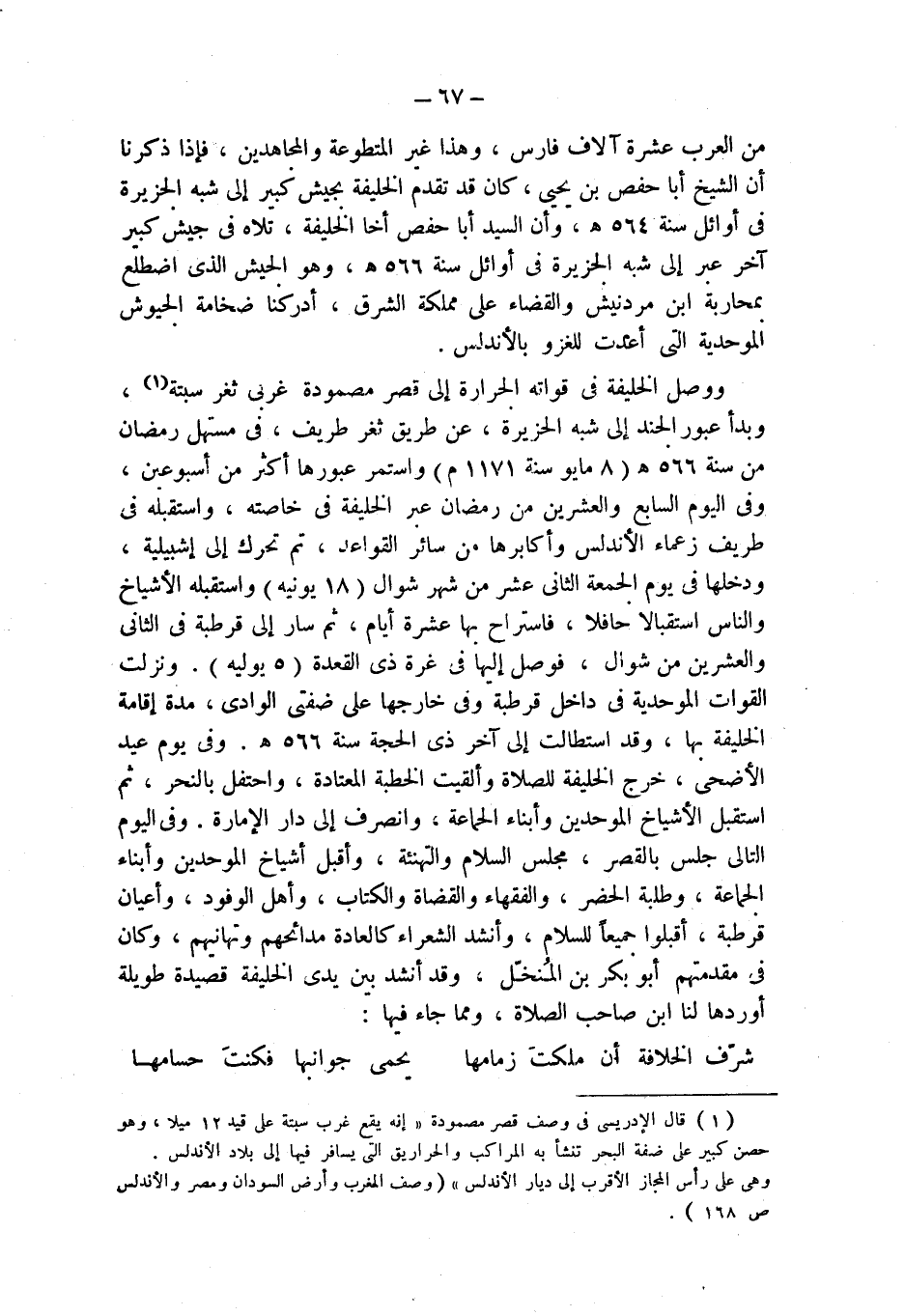 ووصل الخليفة في قواته الجرارة إلى قصر مصمودة غربي ثغر سبتة (¬1)، وبدأ عبور الجند إلى شبه الجزيرة، عن طريق ثغر طريف، في مستهل رمضان من سنة 566 هـ (8 مايو سنة 1171 م) واستمر عبورها أكثر من أسبوعين، وفي اليوم السابع والعشرين من رمضان عبر الخليفة في خاصته، واستقبله في طريف زعماء الأندلس وأكابرها من سائر القواعد، ثم تحرك إلى إشبيلية، ودخلها في يوم الجمعة الثاني عشر من شهر شوال (18 يونيه) واستقبله الأشياخ والناس استقبالا حافلا، فاستراح بها عشرة أيام، ثم سار إلى قرطبة في الثاني والعشرين من شوال، فوصل إليها في غرة ذي القعدة (5 يوليه). ونزلت القوات الموحدية في داخل قرطبة وفي خارجها على ضفتي الوادي، مدة إقامة الخليفة بها، وقد استطالت إلى آخر ذي الحجة سنة 566 هـ. وفي يوم عيد الأضحى، خرج الخليفة للصلاة وألقيت الخطبة المعتادة، واحتفل بالنحر، ثم استقبل الأشياخ الموحدين وأبناء الجماعة، وانصرف إلى دار الإمارة. وفي اليوم التالي جلس بالقصر، مجلس السلام والتهنئة، وأقبل أشياخ الموحدين وأبناء الجماعة، وطلبة الحضر، والفقهاء والقضاة والكتاب، وأهل الوفود، وأعيان قرطبة، أقبلوا جميعاً للسلام، وأنشد الشعراء كالعادة مدائحهم وتهانيهم، وكان في مقدمتهم أبو بكر بن المُنخّل، وقد أنشد بين يدي الخليفة قصيدة طويلة أوردها لنا ابن صاحب الصلاة، ومما جاء فيها: