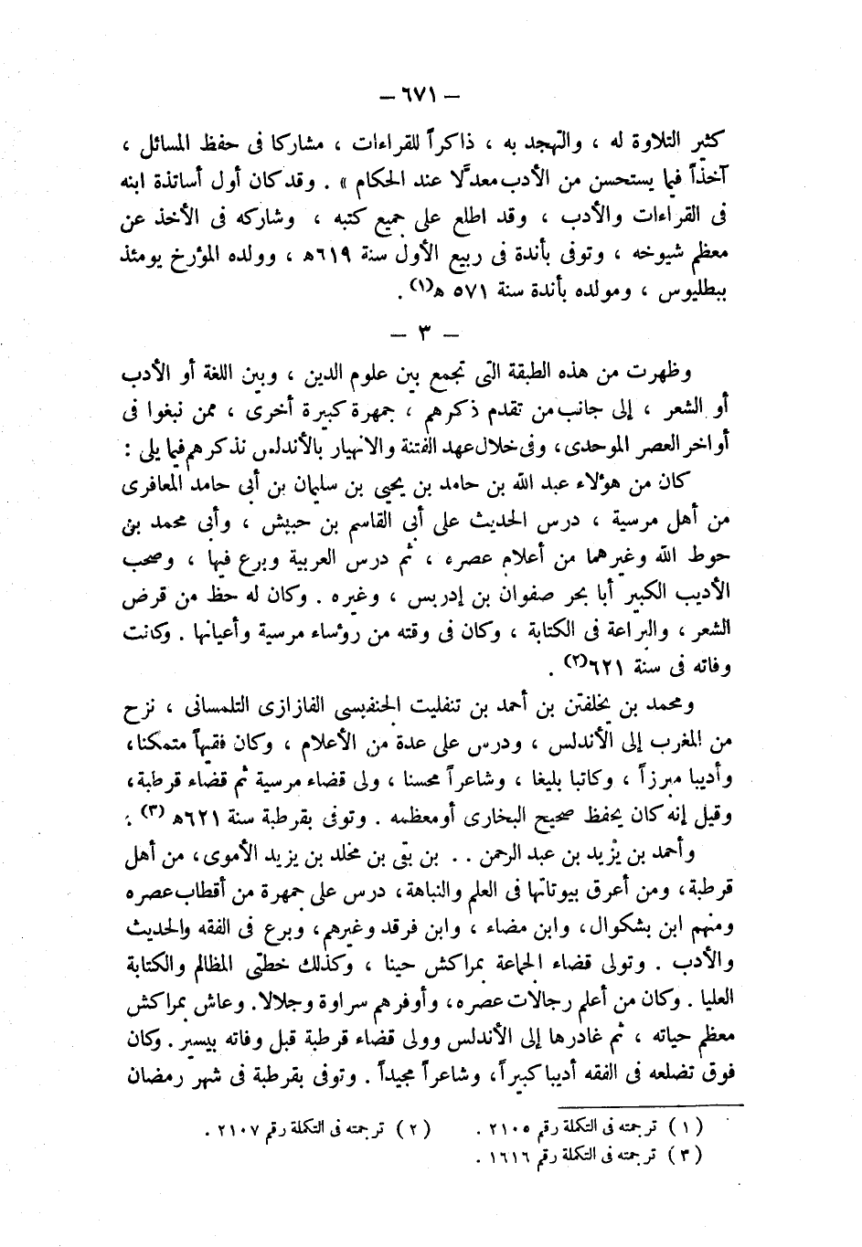 ومحمد بن يخلفتن بن أحمد بن تنفليت الجنفيسي الفازازي التلمساني، نزح من المغرب إلى الأندلس، ودرس على عدة من الأعلام، وكان فقيهاً متمكناً، وأديباً مبرزاً، وكاتباً بليغاً، وشاعراً محسناً، ولى قضاء مرسية ثم قضاء قرطبة، وقيل إنه كان يحفظ صحيح البخاري أو معظمه. وتوفي بقرطبة سنة 621 هـ (¬3). وأحمد بن يزيد بن عبد الرحمن .. بن بقى بن مخلد بن يزيد الأموي، من أهل قرطبة، ومن أعرق بيوتاتها في العلم والنباهة، درس على جمهرة من أقطاب عصره ومنهم ابن بشكوال، وابن مضاء، وابن فرقد وغيرهم، وبرع في الفقه والحديث والأدب. وتولى قضاء الجماعة بمراكش حينا، وكذلك خطتى المظالم والكتابة العليا. وكان من أعلم رجالات عصره، وأوفرهم سراوة وجلالا. وعاش بمراكش معظم حياته، ثم غادرها إلى الأندلس وولي قضاء قرطبة قبل وفاته بيسير. وكان فوق تضلعه في الفقه أديباً كبيراً، وشاعراً مجيداً. وتوفي بقرطبة في شهر رمضان