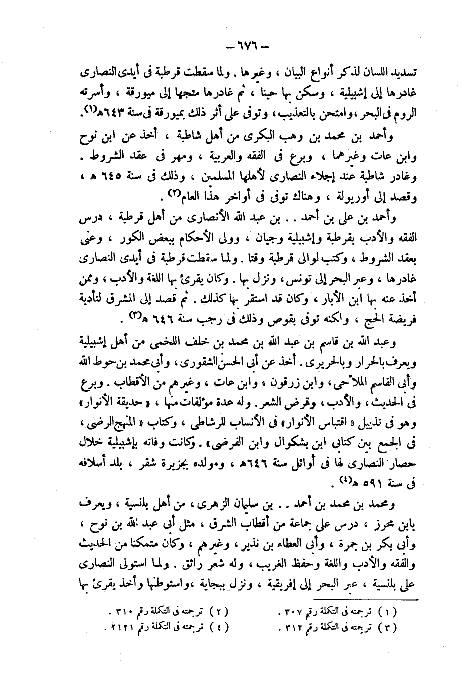تسديد اللسان لذكر أنواع البيان، وغيرها. ولما سقطت قرطبة في أيدي النصارى غادرها إلى إشبيلية، وسكن بها حينا، ثم غادرها متجها إلى ميورقة، وأسرته الروم في البحر، وامتحن بالتعذيب، وتوفي على أثر ذلك بميورقة في سنة 643 هـ (¬1). وأحمد بن محمد بن وهب البكرى من أهل شاطبة، أخذ عن ابن نوح وابن عات وغيرهما، وبرع في الفقه والعربية، ومهر في عقد الشروط. وغادر شاطبة عند إجلاء النصارى لأهلها المسلمين، وذلك في سنة 645 هـ، وقصد إلى أوريولة، وهناك توفي في أواخر هذا العام (¬2).
