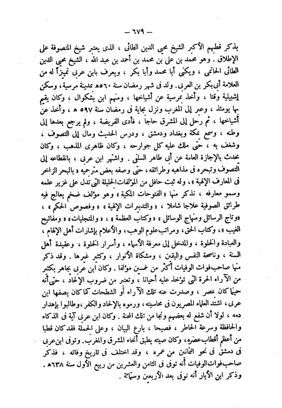 بذكر قطبهم الأكبر الشيخ محيى الدين الطائي، الذي يعتبر شيخ المتصوفة على الإطلاق. وهو محمد بن علي بن محمد بن أحمد بن عبد الله، الشيخ محيى الدين الطائى الحاتمى، ويكنى أبا محمد وأبا بكر، ويعرف بابن عربي تمييزاً له من العلامة أبي بكر بن العربي. ولد في شهر رمضان سنة 560 هـ بمدينة مرسية، وسكن إشبيلية وقتا، وأخذ بمرسية عن أشياخها، ومنهم ابن بشكوال، وكان يقيم بها يومئذ، وعبر إلى المغرب ونزل بجاية في رمضان سنة 597 هـ، وأخذ عن أشياخها، ثم رحل إلى المشرق حاجا، فأدى الفريضة، ولم يرجع بعدها إلى وطنه، وسمع بمكة وبغداد ودمشق، ودرس الحديث ومال إلى التصوف، وشغف به، حتى ملك عليه كل جوارحه، وكان ظاهرى المذهب، وكان يحدث بالإجازة العامة عن أبي طاهر السلفى. واشتهر ابن عربي، بانقطاعه إلى التصوف وتبحره في مذاهبه وطرائقه، حتى وصفه بعض مترجميه " بالبحر الزاخر في المعارف الإلهية "، وله ثبت حافل من المؤلفات الجليلة التي تدل على غزير علمه وسمو معارفه، نذكر منها " الفتوحات المكية " وهو مؤلف ضخم يعالج فيه طرائق الصوفية علاجا شاملا، " والتدبيرات الإلهية " و " فصوص الحكم "، " وتاج الرسائل ومنهاج الوسائل " و " كتاب العظمة "، و " المتجليات " و " مفاتيح الغيب "، و " كتاب الحق "، و " مراتب علوم الوهب "، و " الإعلام بإشارات أهل الإلهام "، و " العبادة والخلوة "، و " المدخل إلى معرفة الأسماء "، و " أسرار الخلوة "، و " عقيدة أهل السنة "، و " ناصحة النفس واليقين "، و " مشكاة الأنوار "، وكثير غيرها. وقد ذكر منها صاحب فوات الوفيات أكثر من خمسين مؤلفا. وكان ابن عربي يجاهر بكثير من الآراء الحرة التي تؤخذ عليه أحيانا، وتعتبر من ضروب الإلحاد، حتى أنه حينما كان بمصر، وصدرت عنه تلك الآراء أو الشطحات كما كان يصفها ابن عربي، اشتد العلماء المصريون في محاسبته، ورموه بالإلحاد والكفر، وطالبوا بإهدار دمه، لولا أن شفع له بعضهم ونجا من تلك المحنة. وكان ابن عربي آية في الذكاء والحافظة وسرعة الخاطر، فصيحا، بارع البيان، وعلى الجملة فقد كان قطبا من أعظم أقطاب عصره، وكان صيته يطبق أنحاء المشرق والمغرب. وتوفي ابن عربي في دمشق في نحو الثمانين من عمره، وقد اختلف في تاريخ وفاته، فذكر صاحب فوات الوفيات أنه توفي في الثامن والعشرين من ربيع الأول سنة 638 هـ. وذكر ابن الأبار أنه توفي بعد الأربعين وستمائة