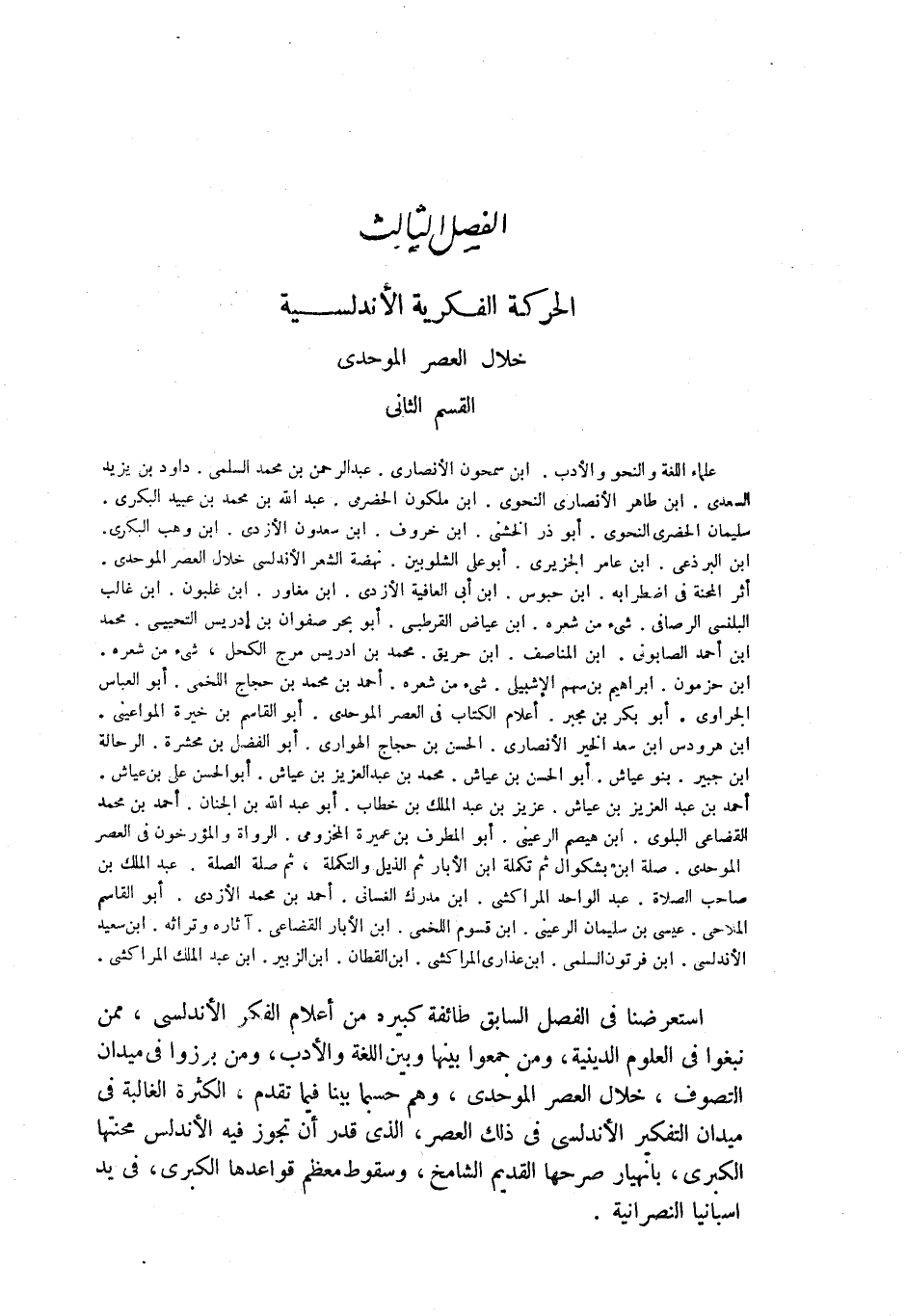 علماء اللغة والنحو والأدب. ابن سمحون الأنصاري. عبد الرحمن بن محمد السلمي. داود بن يزيد السعدى. ابن طاهر الأنصاري النحوي. ابن ملكون الحضرمي، عبد الله بن محمد بن عبيد البكرى. سليمان الحضرمي النحوي. أبو ذر الخشني. ابن خروف. ابن سعدون الأزدي. ابن وهب البكري. ابن البرذعي. ابن عامر الجزيري. أبو علي الشلوبين. نهضة الشعر الأندلسي خلال العصر الموحدي. أثر المحنة في اضطرابه. ابن حبوس. ابن أبي العافية الأزدي. ابن مغاور. ابن غلبون. ابن غالب البلنسي الرصافي. شىء من شعره. ابن عياض القرطبي. أبو بحر صفوان بن إدريس التجيبي. محمد ابن أحمد الصابونى. ابن المناصف. ابن حريق. محمد بن إدريس مرج الكحل، شىء من شعره. ابن حزمون. ابراهيم بن سهم الإشبيلي. شىء من شعره. أحمد بن محمد بن حجاج اللخمى. أبو العباس الجراوى. أبو بكر بن مجبر. أعلام الكتاب في العصر الموحدي. أبو القاسم بن خيرة المواعينى. ابن هرودس ابن سعد الخير الأنصاري. الحسن بن حجاج الهوارى. أبو الفضل بن محشرة. الرحالة ابن جبير. بنو عياش. أبو الحسن بن عياش. محمد بن عبد العزيز بن عياش. أبو الحسن علي بن عياش. أحمد بن عبد العزيز بن عياش. عزيز بن عبد الملك بن خطاب. أبو عبد الله بن الجنان. أحمد بن محمد القضاعى البلوى. ابن هيصم الرعينى. أبو المطرف بن عميرة المخزومي. الرواة والمؤرخون في العصر الموحدي. صلة ابن بشكوال ثم تكملة ابن الأبار ثم الذيل والتكملة، ثم صلة الصلة. عبد الملك بن صاحب الصلاة. عبد الواحد المراكشي. ابن مدرك الغسانى. أحمد بن محمد الأزدي. أبو القاسم الملاحى. عيسى بن سليمان الرعينى. ابن قسوم اللخمى. ابن الأبار القضاعى. آثاره وتراثه. ابن سعيد الأندلسي. بن فرتون السلمى. ابن عذارى المراكشي. ابن القطان. ابن الزبير. ابن عبد الملك المراكشي.