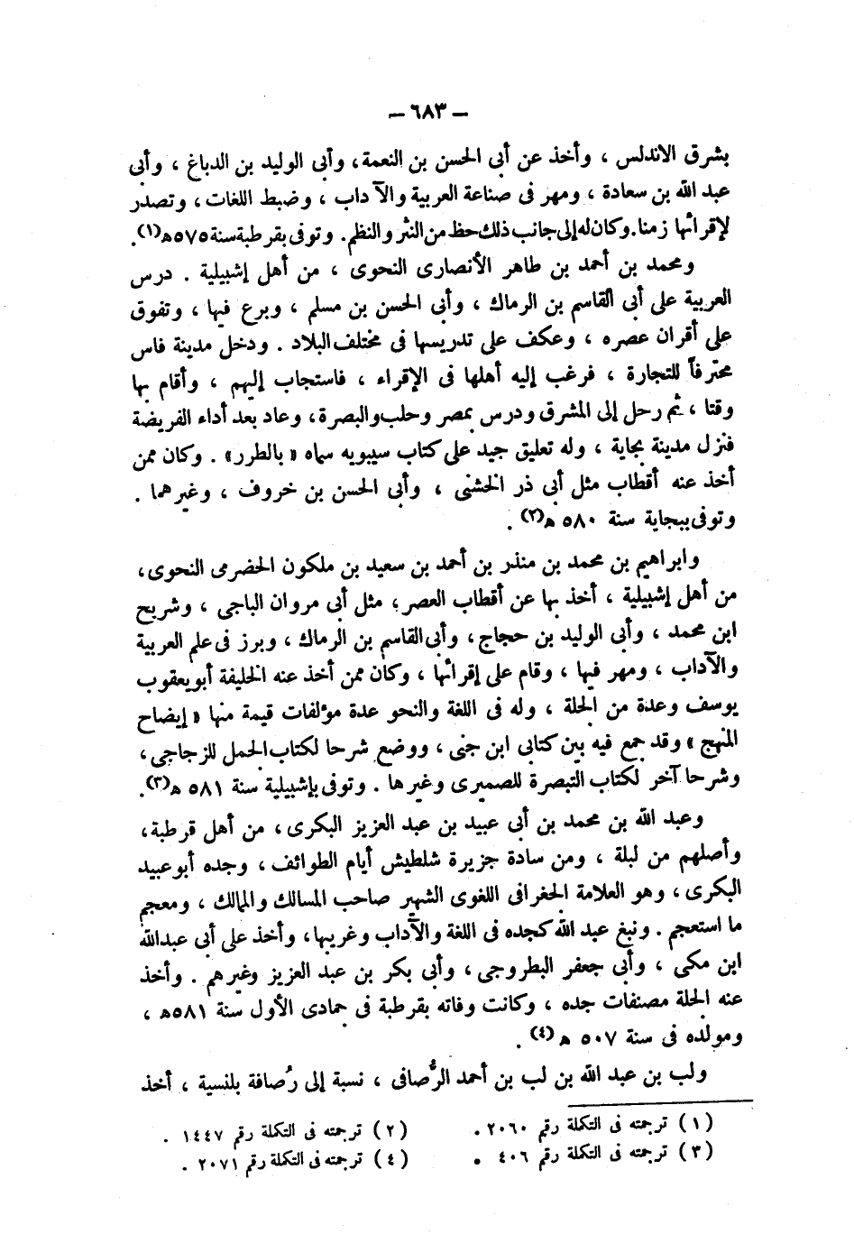 وابراهيم بن محمد بن منذر بن أحمد بن سعيد بن ملكون الحضرمي النحوى، من أهل إشبيلية، أخذ بها عن أقطاب العصر، مثل أبي مروان الباجي، وشريح ابن محمد، وأبي الوليد بن حجاج، وأبي القاسم بن الرماك، وبرز في علم العربية والآداب، ومهر فيها، وقام على إقرائها، وكان ممن أخذ عنه الخليفة أبو يعقوب يوسف وعدة من الجلة، وله في اللغة والنحو عدة مؤلفات قيمة منها " إيضاح المنهج " وقد جمع فيه بين كتابى ابن جنى، ووضع شرحا لكتاب الجمل للزجاجى، وشرحا آخر لكتاب التبصرة للصميرى وغيرها. وتوفي بإشبيلية سنة 581 هـ (¬3).