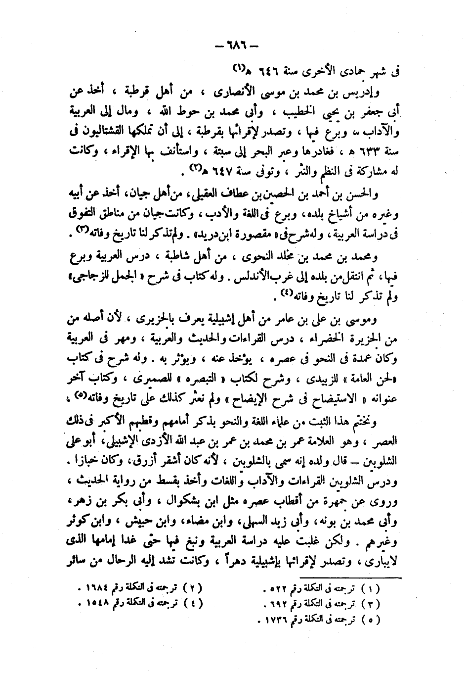 ونختتم هذا الثبت من علماء اللغة والنحو بذكر إمامهم وقطبهم الأكبر في ذلك العصر، وهو العلامة عمر بن محمد بن عمر بن عبد الله الأزدي الإشبيلي، أبو علي الشلوبين - قال ولده إنه سمى بالشلوبين، لأنه كان أشقر أزرق. وكان خبازا. ودرس الشلوبين القراءات والآداب واللغات وأخذ بقسط من رواية الحديث، وروى عن جمهرة من أقطاب عصره مثل ابن بشكوال، وأبي بكر بن زهر، وأبي محمد بن بونه، وأبي زيد السهلي، وابن مضاء، وابن حبيش، وابن كوثر وغيرهم. ولكن غلبت عليه دراسة العربية ونبغ فيها حتى غدا إمامها الذي لا يبارى، وتصدر لإقرائها بإشبيلية دهراً، وكانت تشد إليه الرحال من سائر