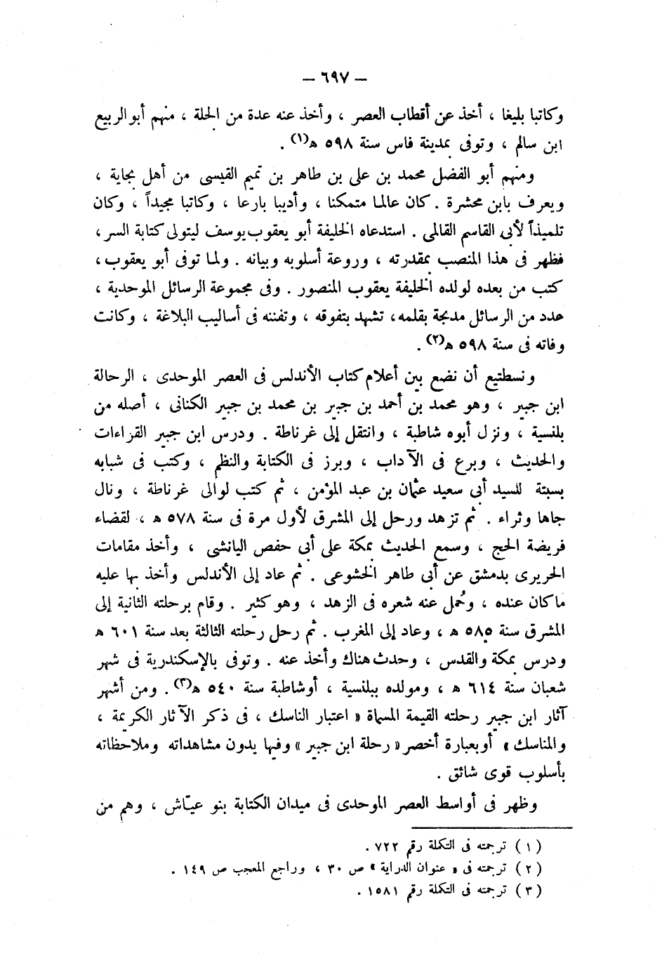 ونستطيع أن نضع بين أعلام كتاب الأندلس في العصر الموحدي، الرحالة ابن جبير، وهو محمد بن أحمد بن جبير بن محمد بن جبير الكنانى، أصله من بلنسية، ونزل أبوه شاطبة، وانتقل إلى غرناطة. ودرس ابن جبير القراءات والحديث، وبرع في الآداب، وبرز في الكتابة والنظم، وكتب في شبابه بسبتة للسيد أبي سعيد عثمان بن عبد المؤمن، ثم كتب لوالى غرناطة، ونال جاها وثراء. ثم تزهد ورحل إلى المشرق لأول مرة في سنة 578 هـ، لقضاء فريضة الحج، وسمع الحديث بمكة على أبي حفص اليانشى، وأخذ مقامات الحريرى بدمشق عن أبي طاهر الخشوعى. ثم عاد إلى الأندلس وأخذ بها عليه ما كان عنده، وحُمل عنه شعره في الزهد، وهو كثير. وقام برحلته الثانية إلى المشرق سنة 585 هـ، وعاد إلى المغرب. ثم رحل رحلته الثالثة بعد سنة 601 هـ ودرس بمكة والقدس، وحدث هناك وأخذ عنه. وتوفي بالإسكندرية في شهر شعبان سنة 614 هـ، ومولده ببلنسية، أو شاطبة سنة 540 هـ (¬3). ومن أشهر آثار ابن جبير رحلته القيمة المسماة " اعتبار الناسك، في ذكر الآثار الكريمة، والمناسك " أو بعبارة أخصر " رحلة ابن جبير " وفيها يدون مشاهداته وملاحظاته بأسلوب قوي شائق.