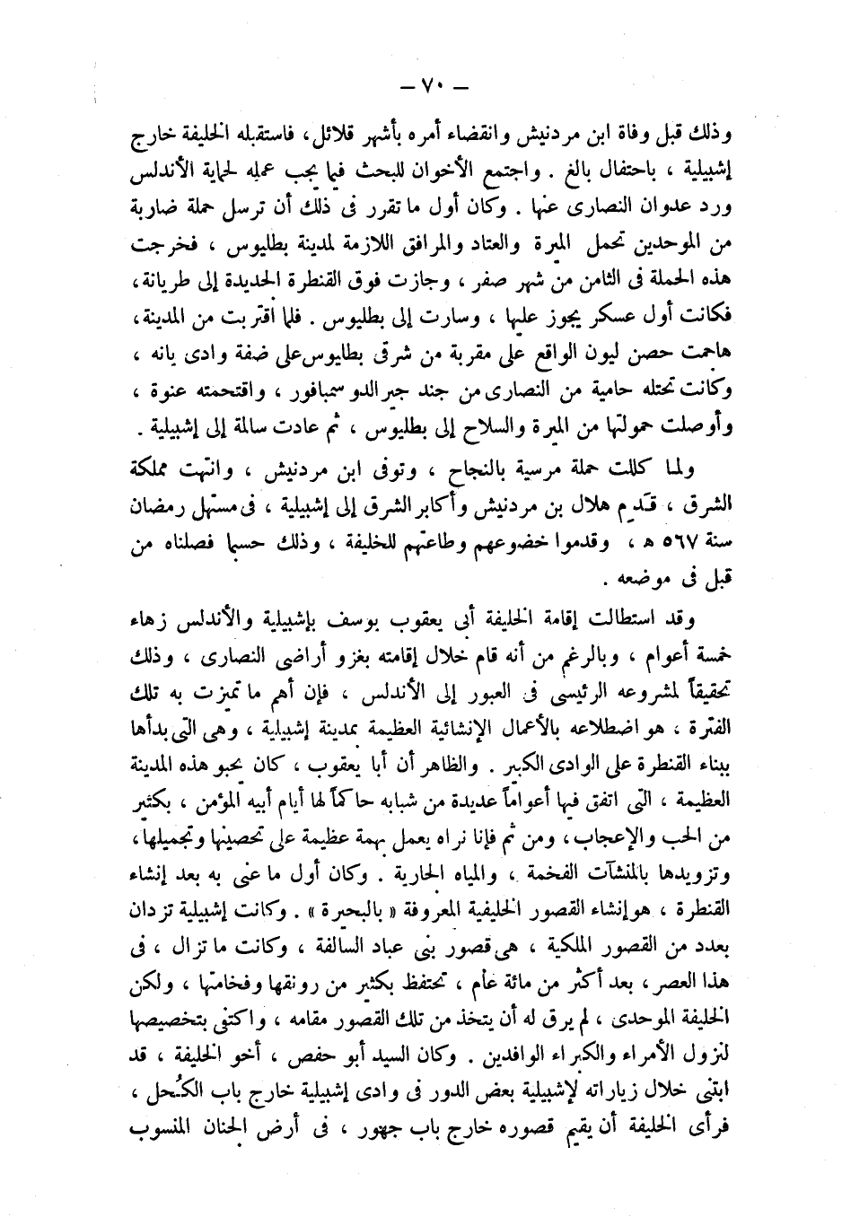 وقد استطالت إقامة الخليفة أبي يعقوب يوسف بإشبيلية والأندلس زهاء خمسة أعوام، وبالرغم من أنه قام خلال إقامته بغزو أراضي النصارى، وذلك تحقيقاً لمشروعه الرئيسي في العبور إلى الأندلس، فإن أهم ما تميزت به تلك الفترة، هو اضطلاعه بالأعمال الإنشائية العظيمة بمدينة إشبيلية، وهي التي بدأها ببناء القنطرة على الوادي الكبير. والظاهر أن أبا يعقوب، كان يحبو هذه المدينة العظيمة، التي أنفق فيها أعواماً عديدة من شبابه حاكماً لها أيام أبيه عبد المؤمن، بكثير من الحب والإعجاب، ومن ثم فإنا نراه يعمل بهمة عظيمة على تحصينها وتجميلها، وتزويدها بالمنشآت الفخمة، والمياه الجارية. وكان أول ما عنى به بعد إنشاء القنطرة، هو إنشاء القصور الخليفية المعروفة " بالبحيرة ". وكانت إشبيلية تزدان بعدد من القصور الملكية، هي قصور بني عباد السالفة، وكانت ما تزال، في هذا العصر، بعد أكثر من مائة عام، تحتفظ بكثير من روعتها وفخامتها، ولكن الخليفة الموحدي، لم يرق له أن يتخذ من تلك القصور مقامه، واكتفى بتخصيصها لنزول الأمراء والكبراء الوافدين. وكان السيد أبو حفص، أخو الخليفة، قد ابتنى خلال زياراته لإشبيلية بعض الدور في وادي إشبيلية خارج باب الكُحل، فرأى الخليفة أن يقيم قصوره خارج باب جهور، في أرض الجنان المنسوب