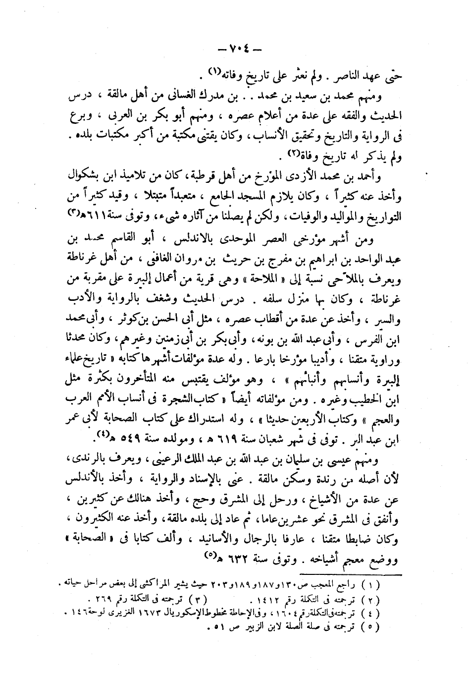 ومنهم محمد بن سعيد بن محمد .. بن مدرك الغسانى من أهل مالقة، درس الحديث والفقه على عدة من أعلام عصره، ومنهم أبو بكر بن العربي، وبرع في الرواية والتاريخ وتحقيق الأنساب، وكان يقتنى مكتبة من أكبر مكتبات بلده. ولم يذكر له تاريخ وفاة (¬2).