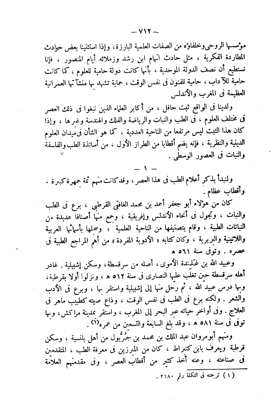 ولدينا في الواقع ثبت حافل، من أكابر العلماء الذين نبغوا في ذلك العصر في مختلف العلوم، في الطب والنبات والرياضة والفلك والهندسة وغيرها، وإذا كان هذا الثبت ليس مرتفعا من الناحية العددية، كما هو الشأن في ميدان العلوم الدينية والنظرية، فإنه يضم أقطابا من الطراز الأول، من أساتذة الطب والفلسفة والنبات في العصور الوسطى.