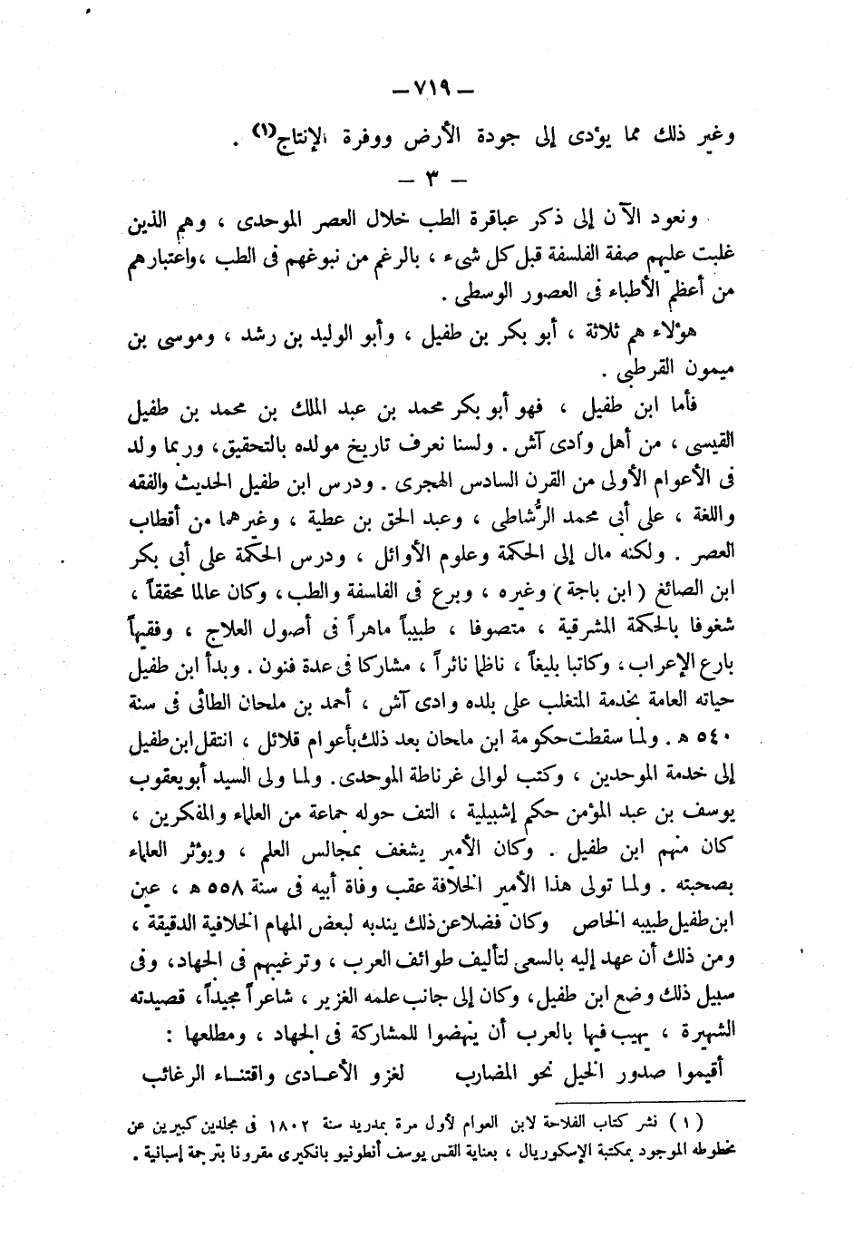 فأما ابن طفيل، فهو أبو بكر محمد بن عبد الملك بن محمد بن طفيل القيسى، من أهل وادي آش. ولسنا نعرف تاريخ مولده بالتحقيق، وربما ولد في الأعوام الأولى من القرن السادس الهجرى. ودرس ابن طفيل الحديث والفقه واللغة، على أبي محمد الرُّشاطى، وعبد الحق بن عطية، وغيرهما من أقطاب العصر. ولكنه مال إلى الحكمة وعلوم الأوائل، ودرس الحكمة على أبي بكر ابن الصائغ (ابن باجة) وغيره، وبرع في الفلسفة والطب، وكان عالماً محققاً، شغوفاً بالحكمة المشرقية، متصوفاً، طبيباً ماهراً في أصول العلاج، وفقيهاً بارع الإعراب. وكاتباً بليغاً، ناظماً ناثراً، مشاركاً في عدة فنون. وبدأ ابن طفيل حياته العامة بخدمة المتغلب على بلده وادي آش، أحمد بن ملحان الطائى في سنة 540 هـ. ولما سقطت حكومة ابن ملحان بعد ذلك بأعوام قلائل، انتقل ابن طفيل إلى خدمة الموحدين، وكتب لوالى غرناطة الموحدي. ولما ولى السيد أبو يعقوب يوسف بن عبد المؤمن حكم إشبيلية، التف حوله جماعة من العلماء والمفكرين، كان منهم ابن طفيل. وكان الأمير يشغف بمجالس العلم، ويؤثر العلماء بصحبته. ولما تولى هذا الأمير الخلافة عقب وفاة أبيه في سنة 558 هـ، عين ابن طفيل طبيبه الخاص وكان فضلا عن ذلك يندبه لبعض المهام الخلافية الدقيقة، ومن ذلك أن عهد إليه بالسعى لتأليف طوائف العرب، وترغيبهم في الجهاد، وفي سبيل ذلك وضع ابن طفيل، وكان إلى جانب علمه الغزير، شاعراً مجيداً، قصيدته الشهيرة، يهيب فيها بالعرب أن ينهضوا للمشاركة في الجهاد، ومطلعها: