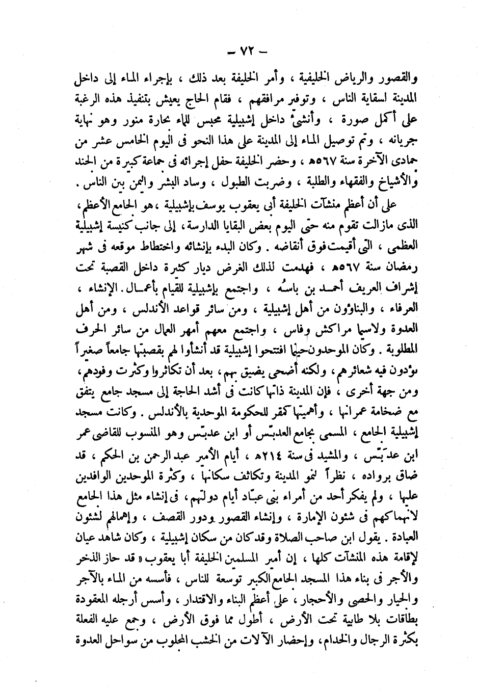 على أن أعظم منشآت الخليفة أبي يعقوب يوسف بإشبيلية، هو الجامع الأعظم، الذي ما زالت تقوم منه حتى اليوم بعض البقايا الدارسة، إلى جانب كنيسة إشبيلية العظمى، التي أقيمت فوق أنقاضه. وكان البدء بإنشائه واختطاط موقعه في شهر رمضان سنة 567 هـ، فهدمت لذلك الغرض ديار كثيرة داخل القصبة تحت إشراف العريف أحمد بن باسُه، واجتمع بإشبيلية للقيام بأعمال الإنشاء، العرفاء، والبناؤون من أهل إشبيلية، ومن سائر قواعد الأندلس، ومن أهل العدوة ولاسيما مراكش وفاس، واجتمع معهم أمهر العمال من سائر الحرف المطلوبة. وكان الموحدون حينما افتتحوا إشبيلية قد أنشأوا لهم بقصبتها جامعاً صغيراً يؤدون فيه شعائرهم، ولكنه أضحى يضيق بهم، بعد أن تكاثروا وكثرت وفودهم، ومن جهة أخرى، فإن المدينة ذاتها كانت في أشد الحاجة إلى مسجد جامع يتفق مع ضخامة عمرانها، وأهميتها كمقر للحكومة الموحدية بالأندلس. وكان مسجد إشبيلية الجامع، المسمى بجامع العدبّس أو ابن عدبّس وهو المنسوب للقاضي عمر ابن عدَبّس، والمشيد في سنة 214 هـ، أيام الأمير عبد الرحمن بن الحكم، قد ضاق برواده، نظراً لنمو المدينة وتكاثف سكانها، وكثرة الموحدين الوافدين عليها، ولم يفكر أحد من أمراء بني عبّاد أيام دولتهم، في إنشاء مثل هذا الجامع لانهماكهم في شئون الإمارة، وإنشاء القصور ودور القصف، وإهمالهم لشئون العبادة. يقول ابن صاحب الصلاة وقد كان من سكان إشبيلية، وكان شاهد عيان لإقامة هذه المنشآت كلها، إن أمير المسلمين الخليفة أبا يعقوب " قد حاز الذخر والأجر في بناء هذا المسجد الجامع الكبير توسعة للناس، فأسسه من الماء بالآجر والجيار والحصى والأحجار، على أعظم البناء والاقتدار، وأسس أرجله المعقودة بطاقات بلاطابية تحت الأرض، أطول مما فوق الأرض، وجمع عليه الفعلة بكثرة الرجال والخدام، وإحضار الآلات من الخشب المجلوب من سواحل العدوة