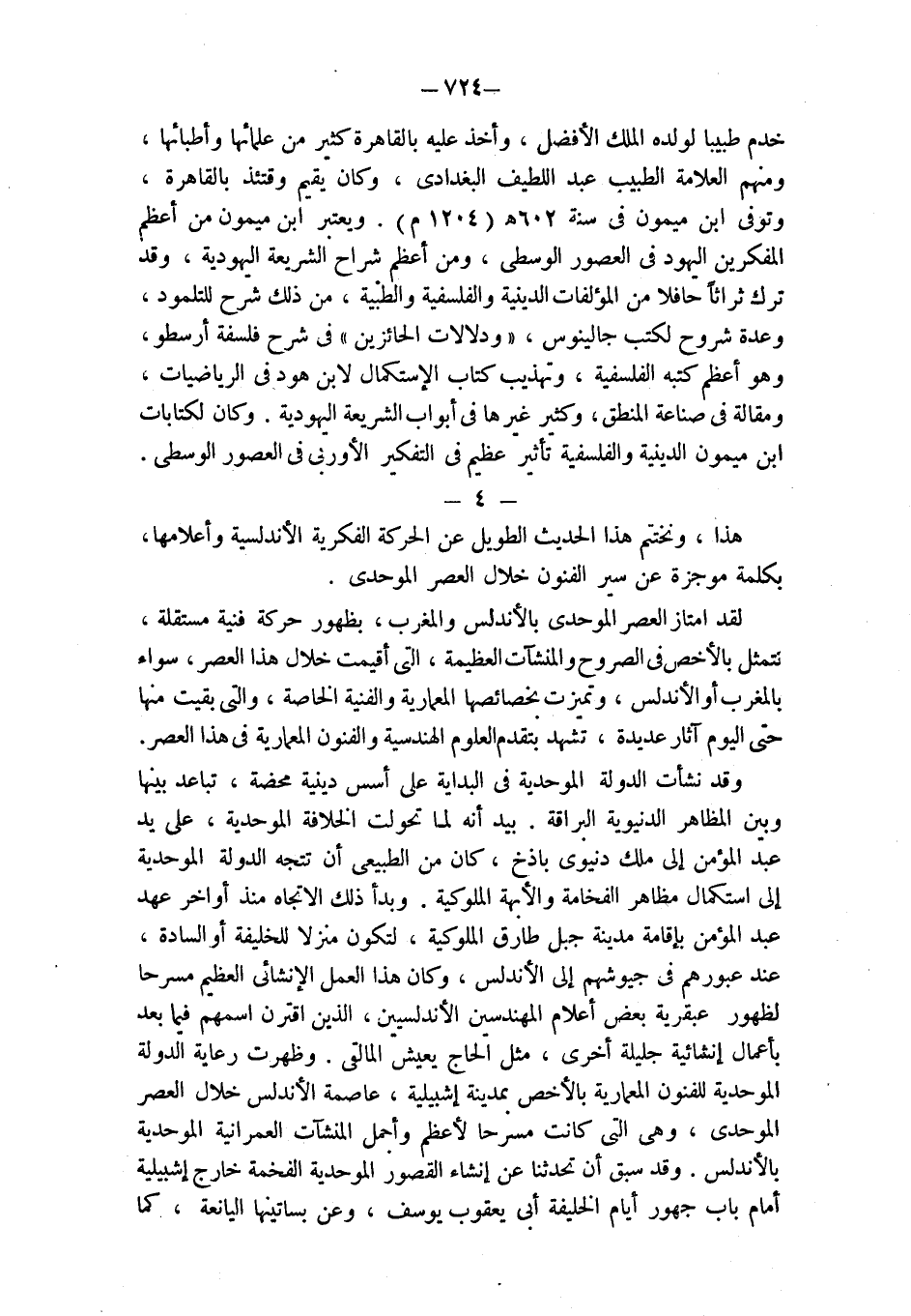 هذا، ونختتم هذا الحديث الطويل عن الحركة الفكرية الأندلسية وأعلامها، بكلمة موجزة عن سير الفنون خلال العصر الموحدي.