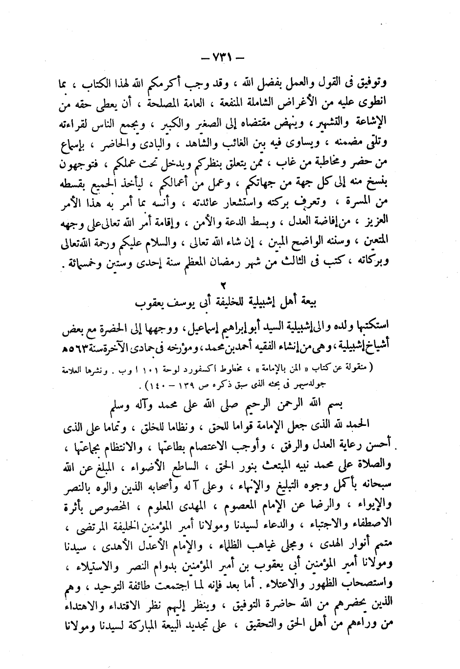 الحمد لله الذي جعل الإمامة قواما للحق، ونظاما للخلق، وتماما على الذي أحسن رعاية العدل والرفق، وأوجب الاعتصام بطاعتها، والانتظام بجماعها، والصلاة على محمد نبيه المبتعث بنور الحق، الساطع الأضواء، المبلغ عن الله سبحانه بأكمل وجوه التبليغ والإنهاء، وعلى آله وأصحابه الذين والوه بالنصر والإيواء، والرضا عن الإمام المعصوم، المهدي المعلوم، المخصوص بأثرة الاصطفاء والاجتباء، والدعاء لسيدنا ومولانا أمير المؤمنين الخليفة المرتضى، متمم أنوار الهدى، ومجلى غياهب الظلماء، والإمام الأعدل الأهدى، سيدنا ومولانا أمير المؤمنين أبي يعقوب بن أمير المؤمنين بدوام النصر والاستيلاء، واستصحاب الظهور والاعتلاء. أما بعد فإنه لما اجتمعت طائفة التوحيد، وهم الذين يحضرهم من الله حاضرة التوفيق، وينظر إليهم نظر الاقتداء والاهتداء من وراءهم من أهل الحق والتحقيق، على تجديد البيعة المباركة لسيدنا ومولانا