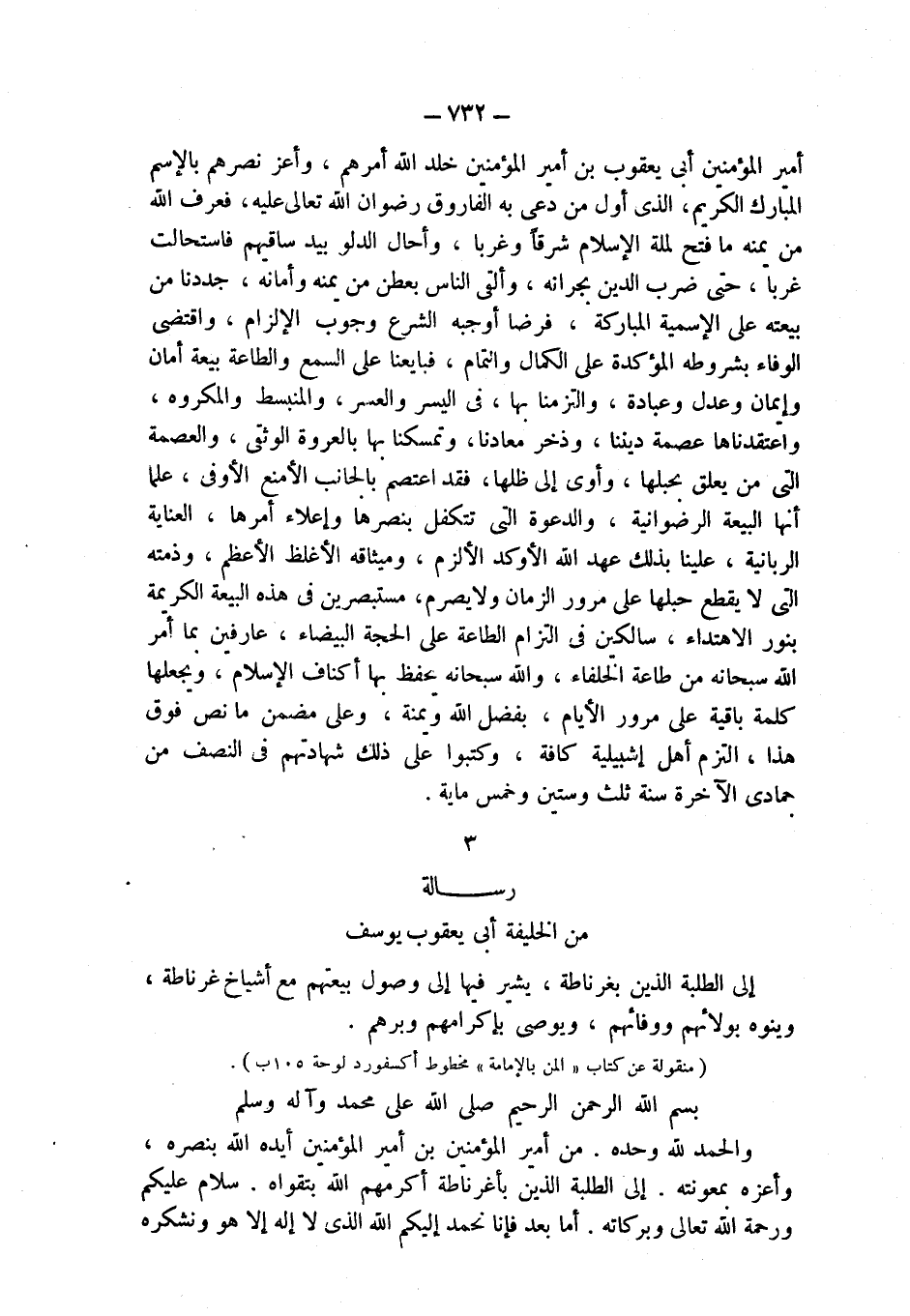 والحمد لله وحده. من أمير المؤمنين بن أمير المؤمنين أيده الله بنصره، وأعزه بمعونته. إلى الطلبة الذين بأغرناطة أكرمهم الله بتقواه. سلام عليكم ورحمة الله تعالى وبركاته. أما بعد فإنا نحمد إليكم الله الذي لا إله إلا هو ونشكره