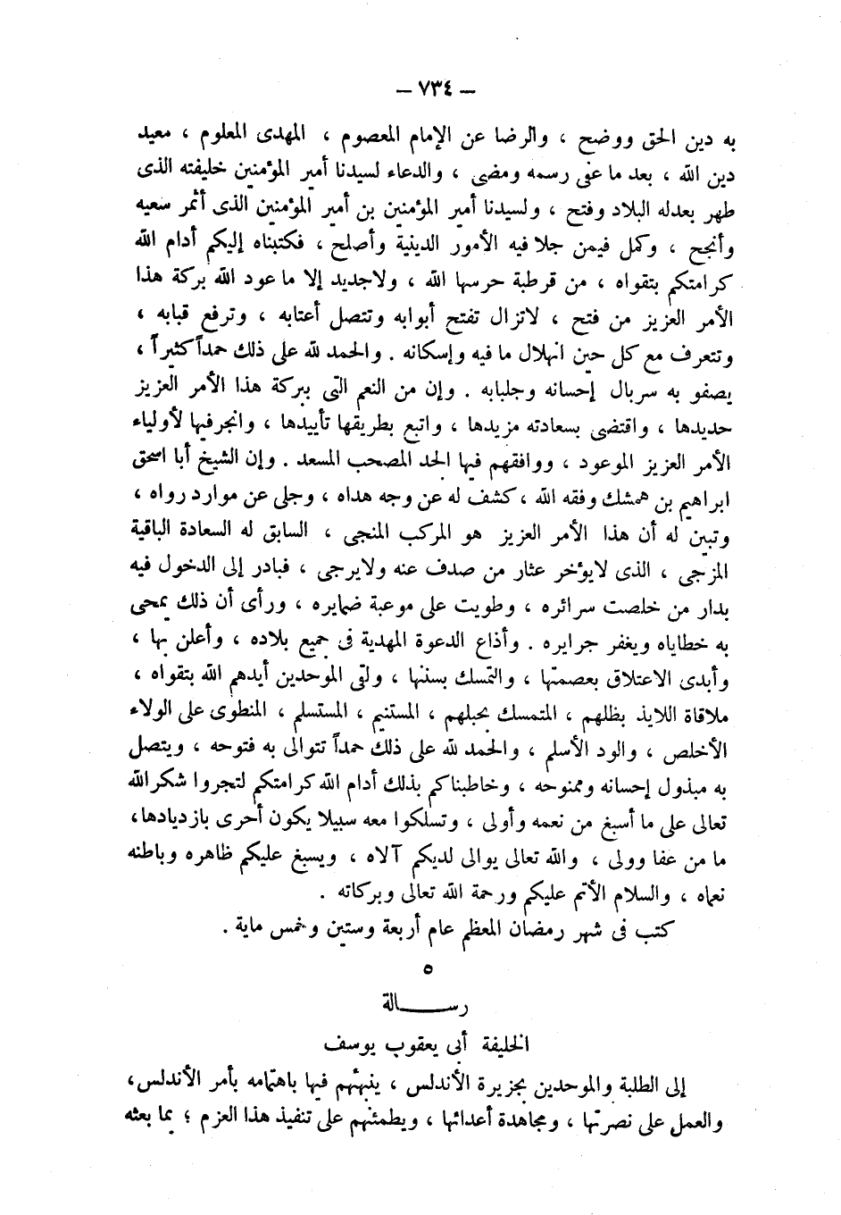 به دين الحق ووضح، والرضا عن الإمام المعصوم، المهدي المعلوم، معيد دين الله، بعد ما عفى رسمه ومضى، والدعاء لسيدنا أمير المؤمنين خليفته الذي طهر بعدله البلاد وفتح، ولسيدنا أمير المؤمنين بن أمير المؤمنين الذي أثمر سعيه وأنجح، وكمل فيمن جلا فيه الأمور الدينية وأصلح، فكتبناه إليكم أدام الله كرامتكم بتقواه، من قرطبة حرسها الله، ولا جديد إلا ما عود الله بركة هذا الأمر العزيز من فتح، لا تزال تفتح أبوابه وتتصل أعتابه، وترفع قبابه، وتتعرف مع كل حين انهلال ما فيه وإسكانه. والحمد لله على ذلك حمداً كثيراً، يصفو به سربال إحسانه وجلبابه. وإن من النعم التي ببركة هذا الأمر العزيز حديدها، واقتضى بسعادته مزيدها، واتبع بطريقها تأييدها، وانجر فيها لأولياء الأمر العزيز الموعود، ووافقهم فيها الجد المصحب المسعد. وإن الشيخ أبا اسحق ابراهيم بن همشك وفقه الله، كشف له عن وجه هداه، وجلى عن موارد رواه، وتبين له أن هذا الأمر العزيز هو المركب المنجى، السابق له السعادة الباقية المزجى، الذي لا يؤخر عثار من صدف عنه ولا يرجى، فبادر إلى الدخول فيه بدار من خلصت سرائره، وطويت على موعبة ضمايره، ورأى أن ذلك يمحى به خطاياه ويغفر جرايره. وأذاع الدعوة المهدية في جميع بلاده، وأعلن بها، وأبدى الاعتلاق بعصمتها، والتمسك بسننها، ولقى الموحدين أيدهم الله بتقواه، ملاقاة اللايذ بظلهم، المتمسك بحبلهم، المستنيم، المستسلم، المنطوى على الولاء الأخلص، والود الأسلم، والحمد لله على ذلك حمداً تتوالى به فتوحه، ويتصل به مبذول إحسانه وممنوحه، وخاطبناكم بذلك أدام الله كرامتكم لتجروا شكر الله تعالى على ما أسبغ من نعمه وأولى، وتسلكوا معه سبيلا يكون أحرى بازديادها، ما من عفا وولي، والله تعالى يوالى لديكم آلاه، ويسبغ عليكم ظاهره وباطنه نعماه، والسلام الأتم عليكم ورحمة الله تعالى وبركاته.