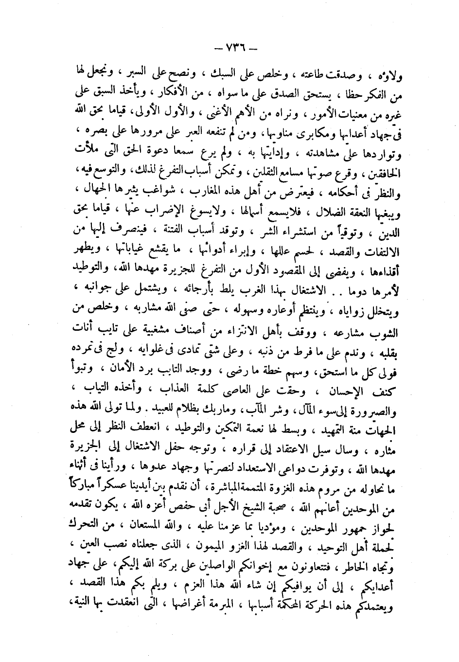 ولاؤه، وصدقت طاعته، وخلص على السبك، ونصح على السبر، ونجعل لها من الفكر حظا، يستحق الصدق على ما سواه، من الأفكار، ويأخذ السبق على غيره من معنيات الأمور، ونراه من الأهم الأغنى، والأول الأولى، قياما بحق الله في جهاد أعدايها ومكابرى مناويها، ومن لم تنفعه العبر على مرورها على بصره، وتواردها على مشاهدته، وإدايتها به، ولم يرع سمعا دعوة الحق التي ملأت الخافقين، وقرع صوتها مسامع الثقلين، وتمكن أسباب التفرغ لذلك، والتوسع فيه، والنظر في أحكامه، فيعترض من أهل هذه المغارب، شواغب يثيرها الجهال، ويبغيها النعقة الضلال، فلا يسمع أسمالها، ولا يسوغ الإضراب عنها، قياما بحق الدين، وتوقياً من استشراء الشر، وتوقد أسباب الفتنة، فينصرف إليها من الالتفات والقصد، لحسم عللها، وإبراء أدوائها، ما يقشع غياباتها، ويطهر أقذاءها، ويفضى إلى المقصود الأول من التفرغ للجزيرة مهدها الله، والتوطيد لأمرها دوما .. الاشتغال بهذا الغرب يلط بأرجائه، ويشتمل على جوانبه، ويتخلل زواياه، وينتظم أوعاره وسهوله، حتى صفى الله مشاربه، وخلص من الشوب مشارعه. ووقف بأهل الانتزاء من أصناف مشغبية على تايب أنات بقلبه، وندم على ما فرط من ذنبه، وعلى شقى تمادى في غلوايه، ولج في تمرده فولى كل ما استحق، وسهم خطة ما رضى، ووجد التايب برد الأمان، وتبوأ كنف الإحسان، وحقت على العاصى كلمة العذاب، وأخذه التياب، والصيرورة إلى سوء المآل، وشر المآب، وما ربك بظلام للعبيد. ولما تولى الله هذه الجهات منة التمهيد، وبسط لها نعمة التمكين والتوطيد، انعطف النظر إلى محل مثاره، وسال سيل الاعتقاد إلى قراره، وتوجه حفل الاشتغال إلى الجزيرة مهدها الله، وتوفرت دواعى الاستعداد لنصرتها وجهاد عدوها، ورأينا في أثناء ما نحاوله من مروم هذه الغزوة المتممة المباشرة، أن نقدم بين أيدينا عسكراً مباركاً من الموحدين أعانهم الله، صحبة الشيخ الأجل أبي حفص أعزه الله، يكون تقدمه لجواز جمهور الموحدين، ومؤديا بما عزمنا عليه، والله المستعان، من التحرك لجملة أهل التوحيد، والقصد لهذا الغزو الميمون، الذي جعلناه نصب العين، وتجاه الخاطر، فتتعاونون مع إخوانكم الواصلين على بركة الله إليكم، على جهاد أعدايكم، إلى أن يوافيكم إن شاء الله هذا العزم، ويلم بكم هذا القصد، ويعتمدكم هذه الحركة المحكمة أسبابها، المبرمة أغراضها، التي انعقدت بها النية،