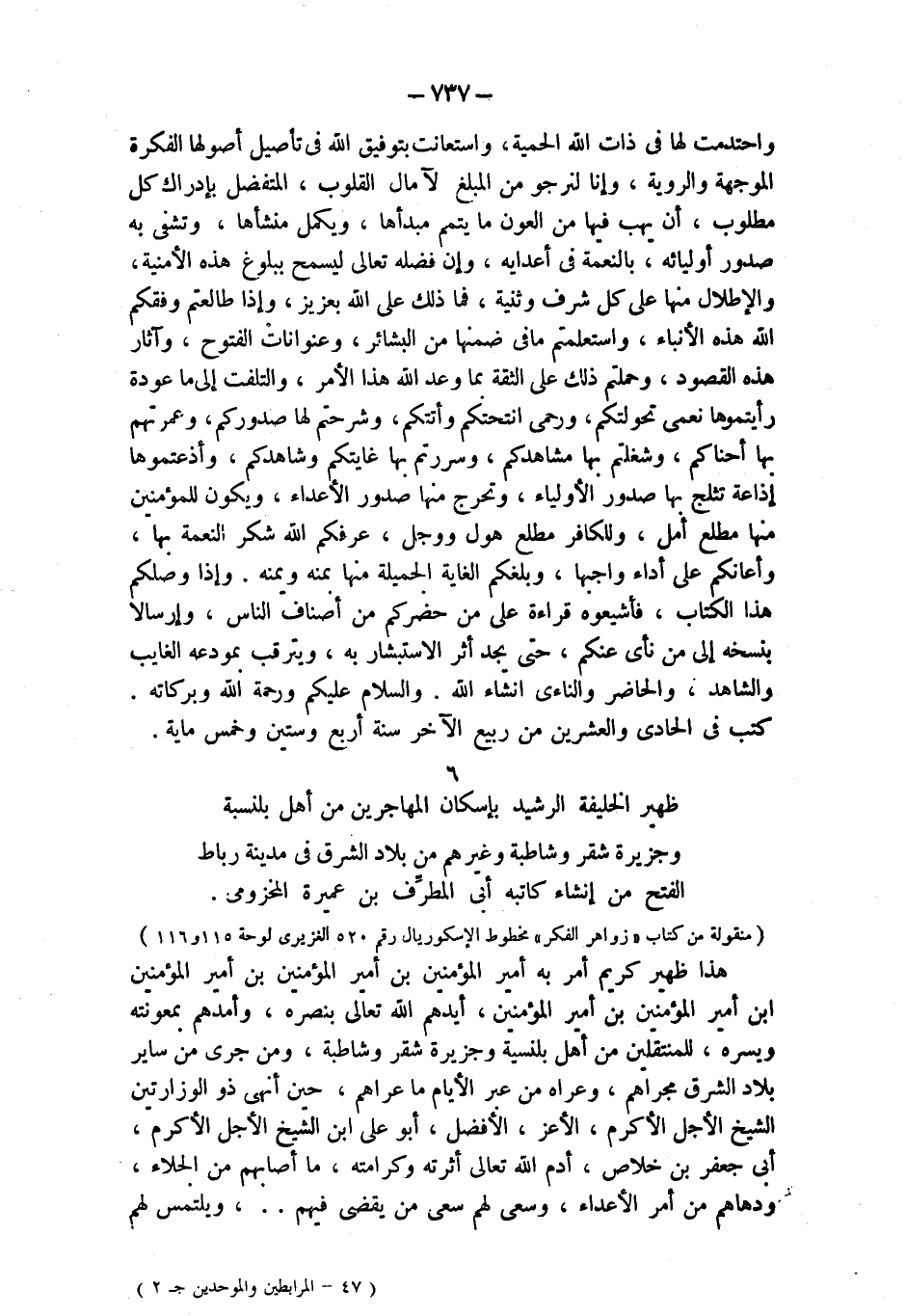 واحتدمت لها في ذات الله الحمية، واستعانت بتوفيق الله في تأصيل أصولها الفكرة الموجهة والروية، وإنا لنرجو من المبلغ لآمال القلوب، المتفضل بإدراك كل مطلوب، أن يهب فيها من العون ما يتمم مبدأها، ويكمل منشأها، وتشفى به صدور أوليائه، بالنعمة في أعدايه، وإن فضله تعالى ليسمح ببلوغ هذه الأمنية، والإطلال منها على كل شرف وثنية، فما ذلك على الله بعزيز، وإذا طالعتم وفقكم الله هذه الأنباء، واستعلمتم ما في ضمنها من البشائر، وعنوانات الفتوح، وآثار هذه القصود، وحملتم ذلك على الثقة مما وعد الله هذا الأمر، والتلفت إلى ما عودة رأيتموها نعمى تحولتكم، ورحمى انتحتكم وأتتكم، وشرحتم لها صدوركم، وعمرتهم بها أحناكم، وشغلتم بها مشاهدكم، وسررتم بها غايتكم وشاهدكم، وأذعتموها إذاعة تثلج بها صدور الأولياء، وتحرج منها صدور الأعداء، ويكون للمؤمنين منها مطلع أمل، وللكافر مطلع هول ووجل، عرفكم الله شكر النعمة بها، وأعانكم على أداء واجبها، وبلغكم الغاية الجميلة منها بمنه ويمنه. وإذا وصلكم هذا الكتاب، فأشيعوه قراءة على من حضركم من أصناف الناس، وإرسالا بنسخه إلى من نأى عنكم، حتى يجد أثر الاستبشار به، ويترقب بمودعه الغايب والشاهد والحاضر والناءى إن شاء الله. والسلام عليكم ورحمة الله وبركاته. كتب في الحادي والعشرين من ربيع الآخر سنة أربع وستين وخمس ماية.