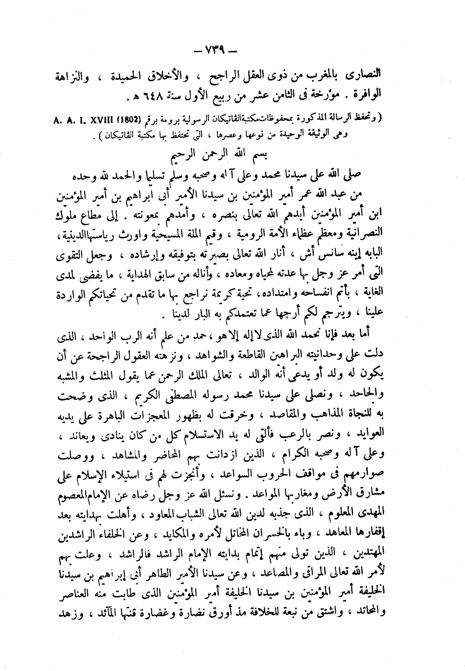 صلى الله على سيدنا محمد وعلى آله وصحبه وسلم تسليما والحمد لله وحده من عبد الله عمر أمير المؤمنين بن سيدنا الأمير أبي ابراهيم بن أمير المؤمنين ابن أمير المؤمنين أيدهم الله تعالى بنصره، وأمدهم بمعونته. إلى مطاع ملوك النصرانية ومعظم عظماء الأمة الرومية، وقيم الملة المسيحية ووارث رياستها الدينية، البابه إينه سانس أش، أنار الله تعالى بصيرته بتوفيقه وإرشاده، وجعل التقوى التي أمر عز وجل بها عدته لمحياه ومعاده، وأناله من سابق الهداية ما يفضى لمدى الغاية، بأتم انفساحه وامتداده، تحية كريمة نراجع بها ما تقدم من تحياتكم الواردة علينا، ويترجم لكم أرجها عما تعتمدكم به البار لدينا.