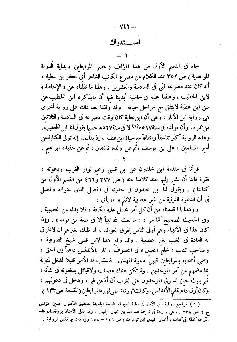(¬1) تراجع رواية ابن الأبار في الحلة السيراء الطبعة الجديدة بتحقيق الدكتور حسين مؤنس ج 2 ص 238. وهي واردة في ترجمة عبد الله بن خيار الجيانى. وقد نقل الأستاذ بروفنسال هذه الترجمة كذلك في كتاب " أخبار المهدي ابن تومرت " ص 146 - 148 ووردت بها نفس الرواية
