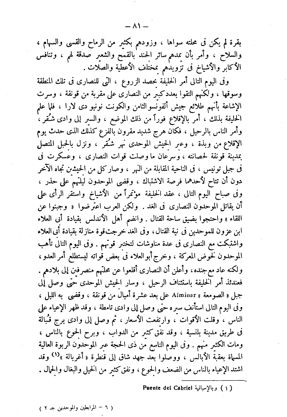 وفي اليوم التالي أمر الخليفة بحصد الزروع، التي للنصارى في تلك المنطقة وسوقها، ولكنهم التقوا بعدد كبير من النصارى على مقربة من قونقة، وسرت الإشاعة بأنهم طلائع جيش ألفونسو الثامن والكونت نونيو دي لارا، فلما علم الخليفة بذلك، أمر بالإقلاع فوراً من ذلك الموضع، والسير إلى وادي شُقر، وأمر الناس بالرحيل، فكان هرج شديد مقرون بالفزع كذلك الذي حدث يوم الإقلاع من وبذة، وعبر الجيش الموحدي نهر شُقر، ونزل بالجبل المتصل بمدينة قونقة لحصانته، وسرعان ما وصلت قوات النصارى، وعسكرت في في جبل تونيس، في الناحية المقابلة من النهر، وصار كل من الجيشين تجاه الآخر دون أن تتاح لأحدهما فرصة الاشتباك، وقضى الموحدون ليلتهم على حذر، وفي صباح اليوم التالي، عقد الخليفة مؤتمراً من الأشياخ واستقر الرأي على أن يقاتل الموحدون النصارى في الغد. ولكن العرب اعترضوا " وجبنوا عن اللقاء " واحتجوا بضيق ساحة القتال. وانضم أهل الأندلس بقيادة أبي العلاء ابن عزون للموحدين في نية القتال، وفي الغد خرجت قوة منازلة بقيادة أبي العلاء واشتبكت مع النصارى في عدة مناوشات لتختبر قوتهم. وفي اليوم التالي تأهب الموحدون لخوض المعركة، وخرج أبو العلاء في بعض قواته ليستطلع أمر العدو، ولكنه عاد مع جنده، وأعلن أن النصارى أقلعوا عن محلتهم منصرفين إلى بلادهم. فعندئذ أمر الخليفة باستئناف الرحيل، وسار الجيش الموحدي حتى وصل إلى جبل " الصومعة " Alminar على بعد عشرة أميال من قونقة، وقضى به الليل، وفي اليوم التالي استأنف سيره حتى وصل إلى وادي تامطة، وقد ظهر الإعياء على الناس، وقلت الأقوات، وارتفعت الأسعار، ثم وصل إلى وادي برج قُبالة في طريق مدينة بلنسية، وقد نفق كثير من الدواب، وبرح الجوع بالناس، ومات الكثير منهم. وفي اليوم التاسع من ذي الحجة عبر الموحدون الربوة العالية المسماة بعقبة الأبالس، ووصلوا بعد جهد شاق إلى قنطرة " أغربالة " (¬1) وقد اشتد الإعياء بالناس من الضعف والجوع، ونفق كثير من الخيل والبغال والجمال.