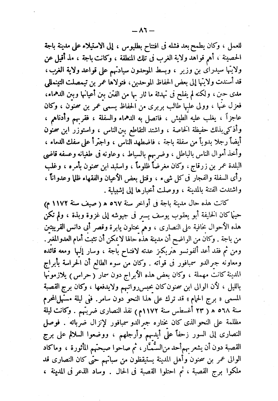 للعمل، وكان يطمح بعد فشله في افتتاح بطليوس، إلى الاستيلاء على مدينة باجة الحصينة، أهم قواعد ولاية الغرب في تلك المنطقة، وكانت باجة، مذ أقيل عن ولايتها سيدراى بن وزير، وبسط الموحدون سيادتهم على قواعد ولاية الغرب، قد أسندت ولايتها إلى بعض الحفاظ الموحدين، فتولاها عمر بن تيمصلت التينمللي مدى حين، ولكنه لم يفلح في تهدئة ما ثار بها من الفتن بين أعيانها وبين الدهماء، فعزل عنها، وولى عليها طالب بربري من الحفاظ يسمى عمر بن سحنون، كان عاجزاً، يغلب عليه الطيش، فاتصل به الدهماء والسفلة، فقربهم وأدناهم، وأذكى بذلك حفيظة الخاصة، واشتد التقاطع بين الناس، واستوزر ابن سحنون أيضاً رجلا بدوياً من سفلة باجة، فاضطهد الناس، واجترأ على سفك الدماء، وأخذ أموال الناس بالباطل، وضربهم بالسياط، وعاونه في طغيانه وعسفه قاضي البلدة عمر بن زرقاج، وكان مغرضاً ظلوماً، واستبد ابن سحنون بأمره، وغلب رأي السفلة والفجار في كل شىء، وقتل بعض الأعيان والفقهاء ظلماً وعدواناً، واشتدت الفتنة بالمدينة، ووصلت أخبارها إلى إشبيلية.
