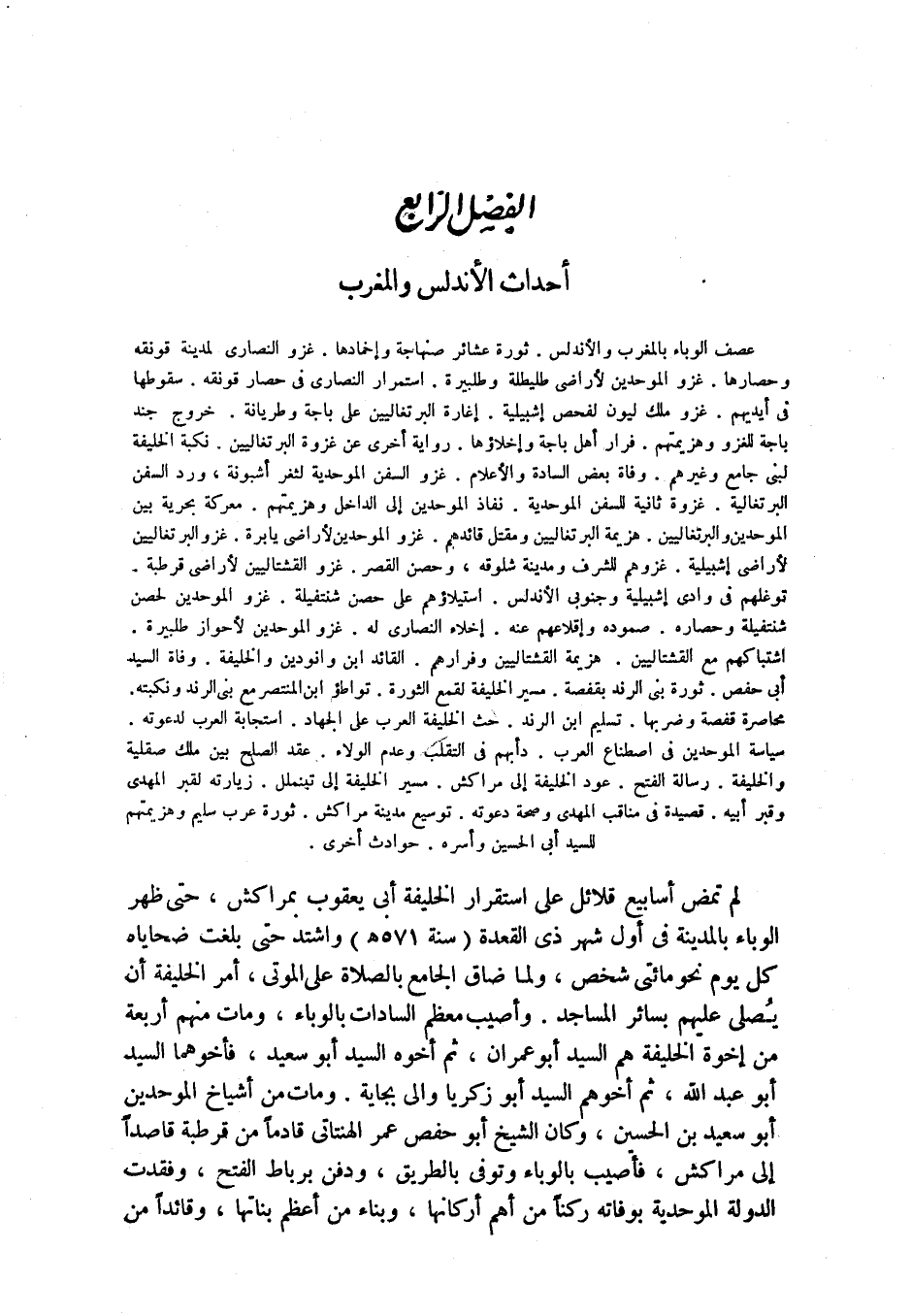 عصف الوباء بالمغرب والأندلس. ثورة عشائر صنهاجة وإخمادها. غزو النصارى لمدينة قونقه وحصارها. غزو الموحدين لأراضي طليطلة وطلبيرة. استمرار النصارى في حصار قونقه. سقوطها في أيديهم. غزو ملك ليون لفحص إشبيلية. إغارة البرتغاليين على باجة وطريانة. خروج جند باجة للغزو وهزيمتهم. فرار أهل باجة وإخلاؤها. رواية أخرى عن غزوة البرتغاليين. نكبة الخليفة لبني جامع وغيرهم. وفاة بعض السادة والأعلام. غزو السفن الموحدية لثغر أشبونة، ورد السفن البرتغالية. غزوة ثانية للسفن الموحدية. نفاذ الموحدين إلى الداخل وهزيمتهم. معركة بحرية بين الموحدين والبرتغاليين. هزيمة البرتغاليين ومقتل قائدهم. غزو الموحدين لأراضي يابرة. غزو البرتغاليين لأراضي إشبيلية. غزوهم للشرف ومدينة شلوقه، وحصن القصر. غزو القشتاليين لأراضي قرطبة. توغلهم في وادي إشبيلية وجنوبي الأندلس. استيلاؤهم على حصن شنتفيلة. غزو الموحدين لحصن شنتفيلة وحصاره. صموده وإقلاعهم عنه. إخلاء النصارى له. غزو الموحدين لأحواز طلبيرة. اشتباكهم مع القشتاليين. هزيمة القشتاليين وفرارهم. القائد ابن وانودين والخليفة. وفاة السيد أبي حفص. ثورة بني الرند بقفصة. مسير الخليفة لقمع الثورة. تواطؤ ابن المنتصر مع بني الرند ونكبته. محاصرة قفصة وضربها. تسليم ابن الرند. حث الخليفة العرب على الجهاد. استجابة العرب لدعوته. سياسة الموحدين في اصطناع العرب. دأبهم في التقلب وعدم الولاء. عقد الصلح بين ملك صقلية والخليفة. رسالة الفتح. عود الخليفة إلى مراكش. مسير الخليفة إلى تينملل. زيارته لقبر المهدي وقبر أبيه. قصيدة في مناقب المهدي وصحة دعوته. توسيع مدينة مراكش. ثورة عرب سليم وهزيمتهم للسيد أبي الحسين وأسره. حوادث أخرى.