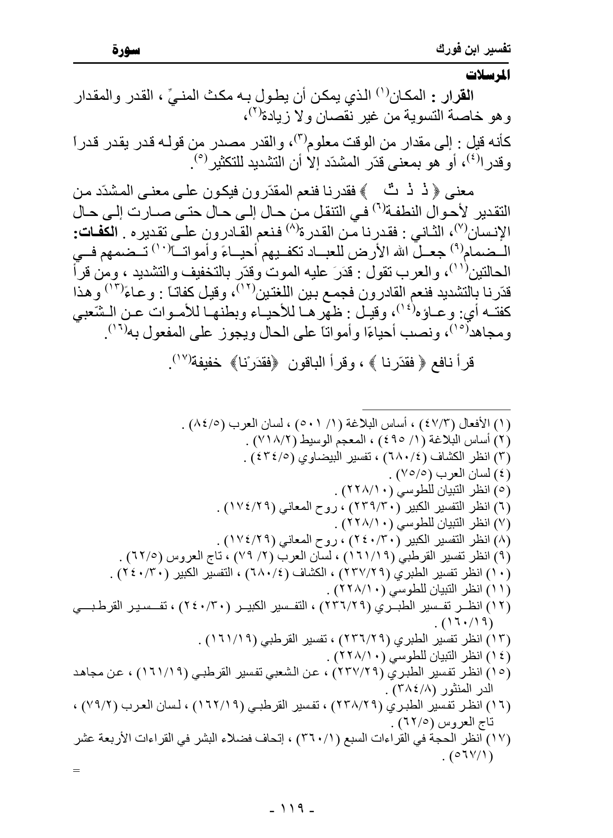الكفات: الضمام جعل الله الأرض للعباد تكفيهم أحياءً وأمواتاً تضمهم في الحالتين، والعرب تقول: قَدَرَ عليه الموت وقدّر بالتخفيف والتشديد، ومن قرأ قدّرنا بالتشديد فنعم القادرون فجمع بين اللغتين.
