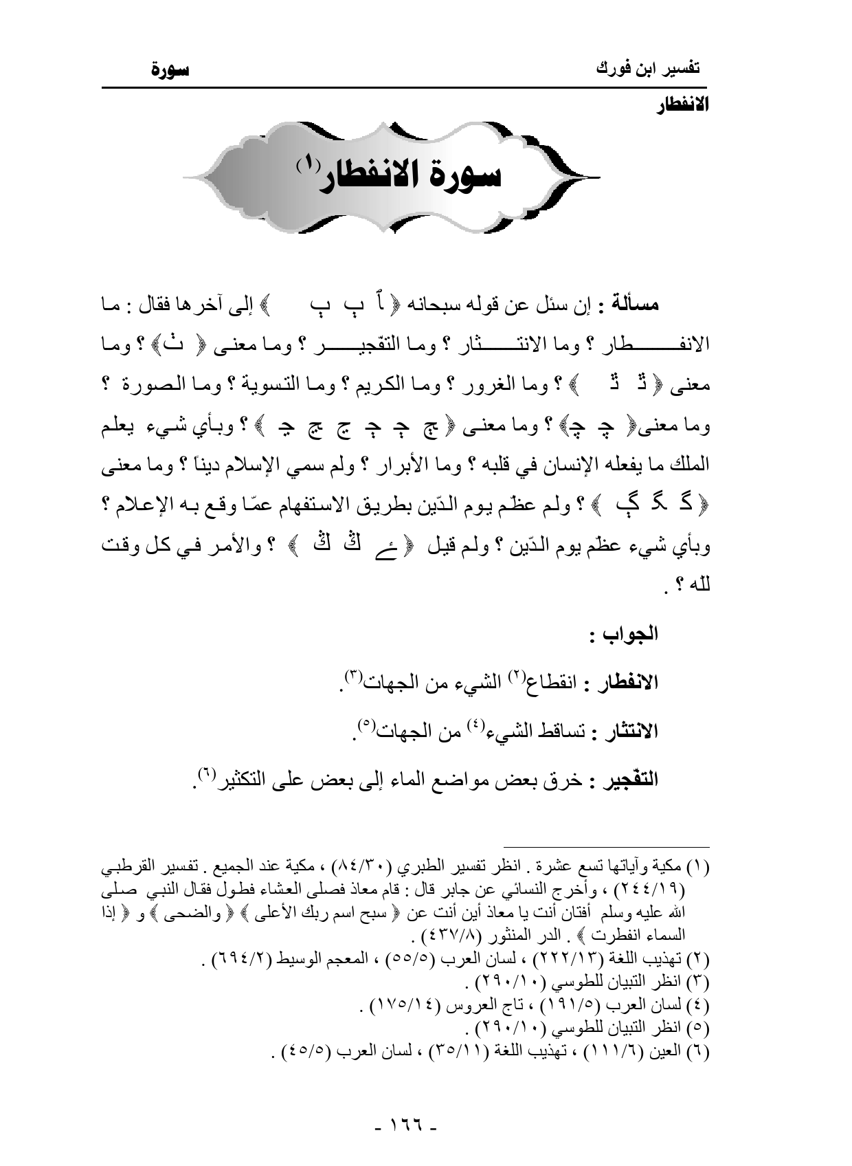 مسألة: إن سئل عن قوله سبحانه {إِذَا السَّمَاءُ انْفَطَرَتْ (1) }