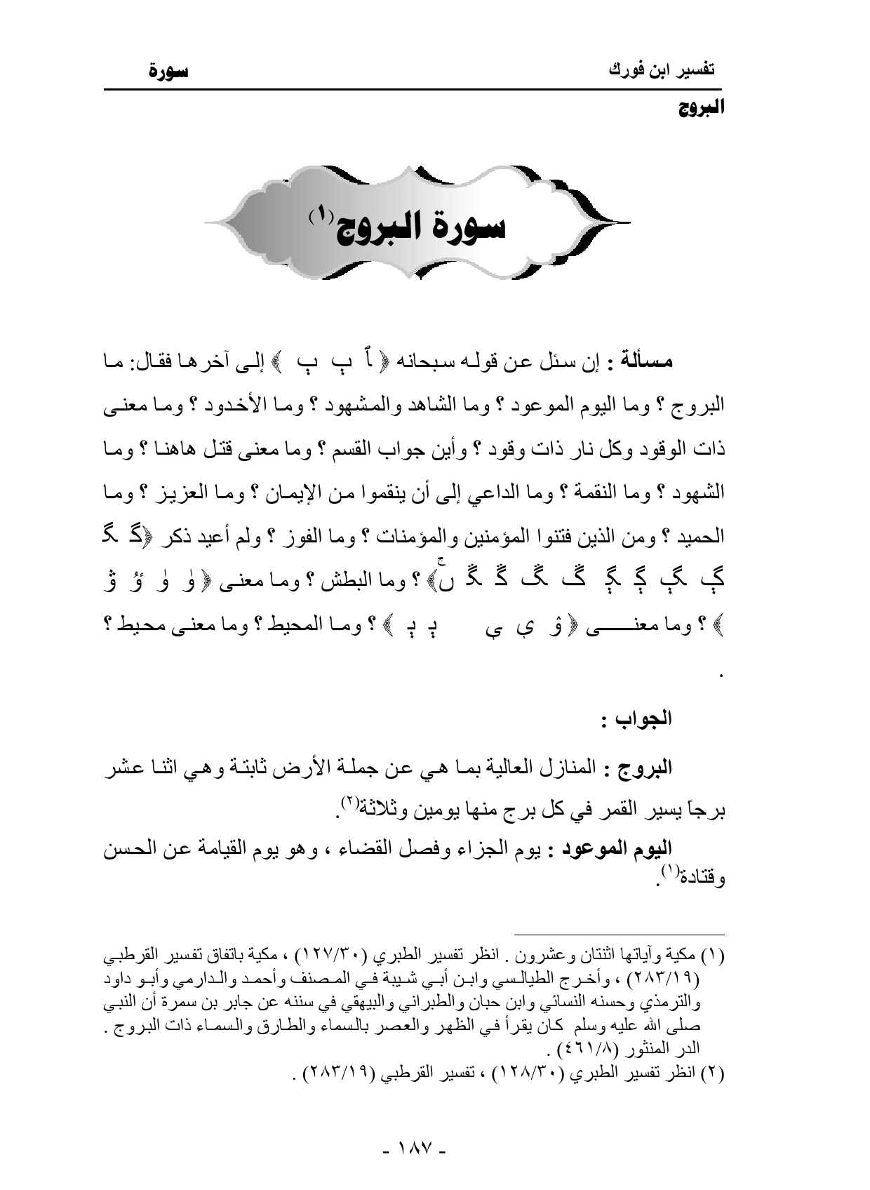 ما البروج؟ وما اليوم الموعود؟ وما الشاهد والمشهود؟ وما الأخدود؟ وما معنى: ذات الوقود وكل نار ذات وقود؟ وأين جواب القسم؟ وما معنى: قُتل هاهنا؟ وما الشهود؟ وما النقمة؟ وما الداعي إلى أن ينقموا من الإيمان؟ وما العزيز؟ وما الحميد؟ ومن الذين فتنوا المؤمنين والمؤمنات؟
