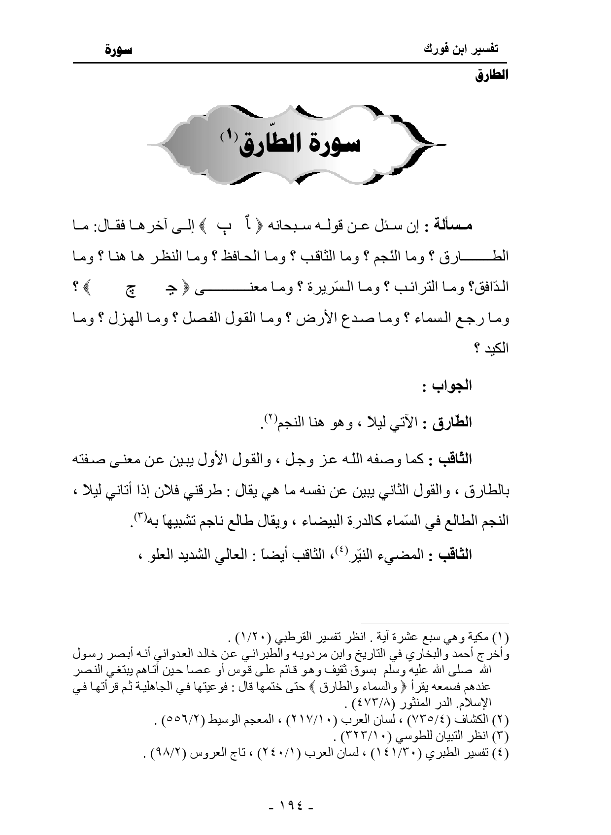 مسألة: إن سئل عن قوله سبحانه {وَالسَّمَاءِ وَالطَّارِقِ (1) }