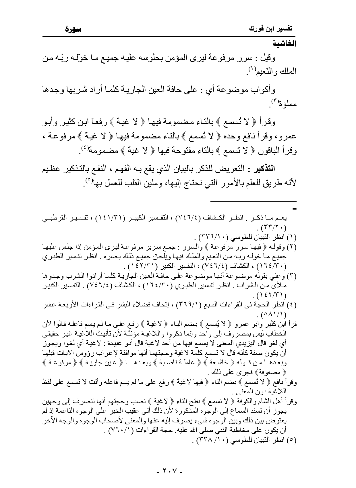 وقرأ {لَا تُسْمَعُ} بالتاء مضمومة فيها {لَاغِيَةً} رفعاً ابن كثير وأبو عمرو، وقرأ نافع وحده {لَا تُسْمَعُ} بالتاء مضمومة فيها {لَاغِيَةٌ} مضمومة