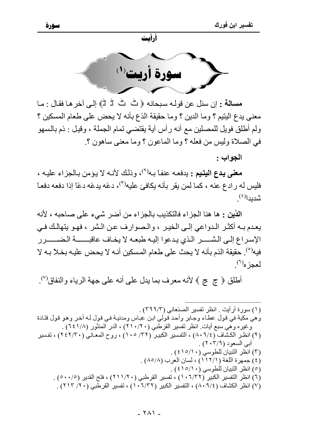 مسالة: إن سئل عن قوله سبحانه {أَرَأَيْتَ الَّذِي يُكَذِّبُ بِالدِّينِ (1) }