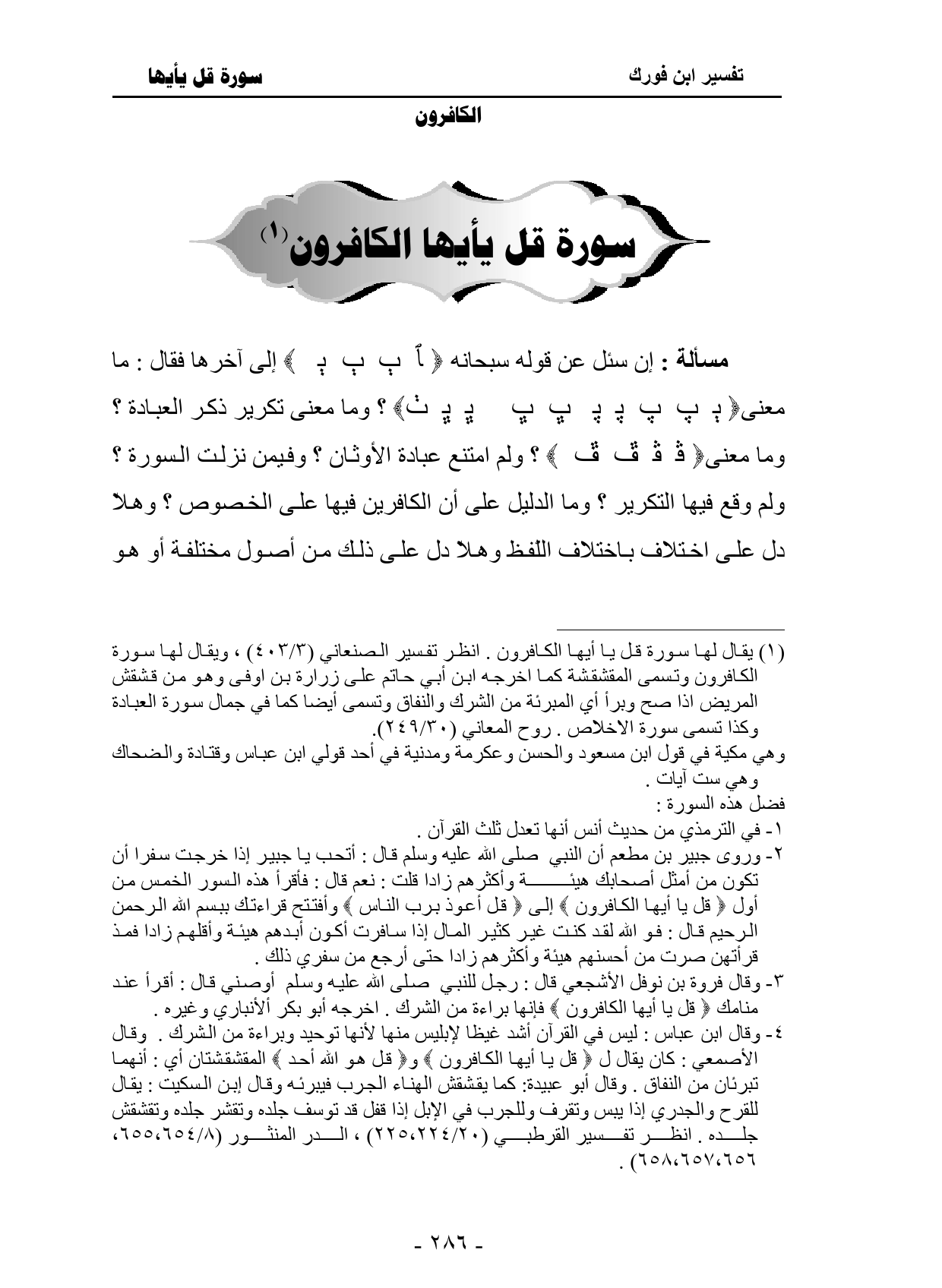 مسألة: إن سئل عن قوله سبحانه {قُلْ يَا أَيُّهَا الْكَافِرُونَ (1) }
