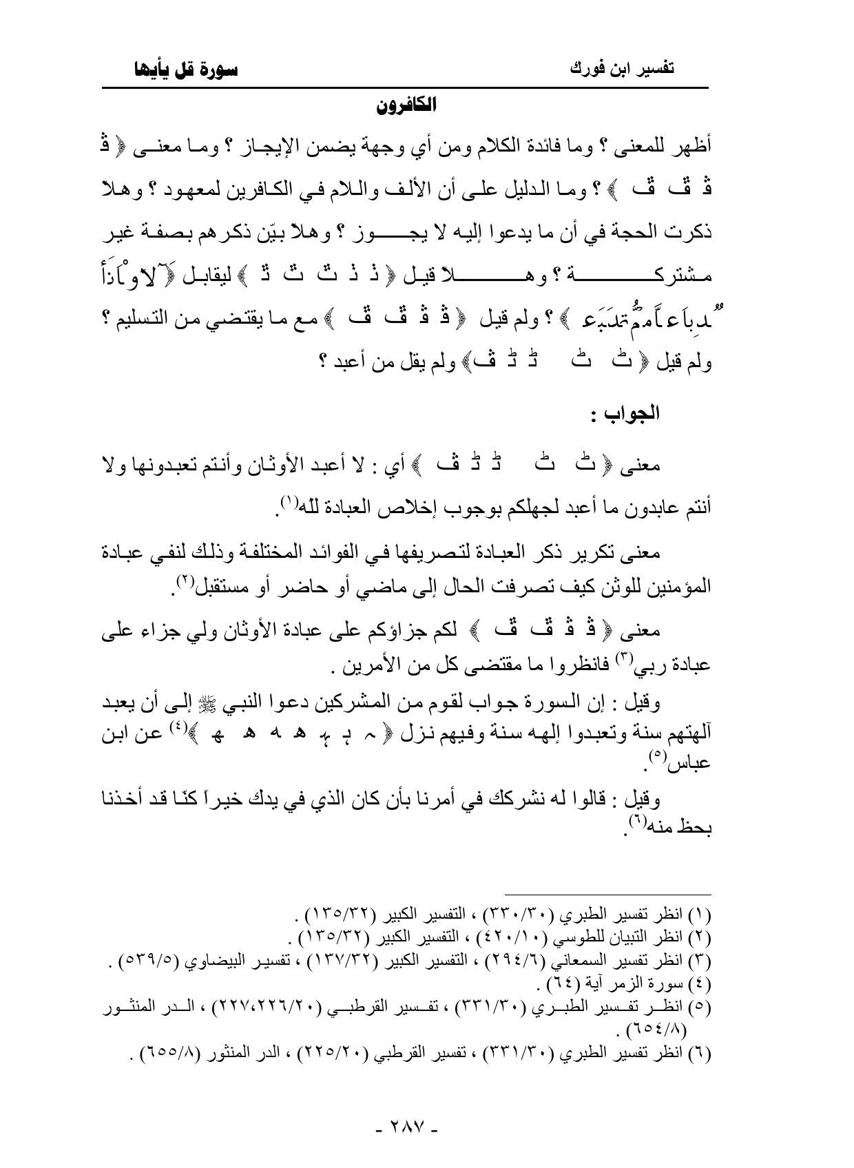 وقيل: إن السورة جواب لقوم من المشركين دعوا النبي - صلى الله عليه وسلم - إلى أن يعبد آلهتهم سنة ويعبدوا هم إلهه سنة وفيهم نزل {قُلْ أَفَغَيْرَ اللَّهِ تَأْمُرُونِّي أَعْبُدُ أَيُّهَا الْجَاهِلُونَ (64) } .
