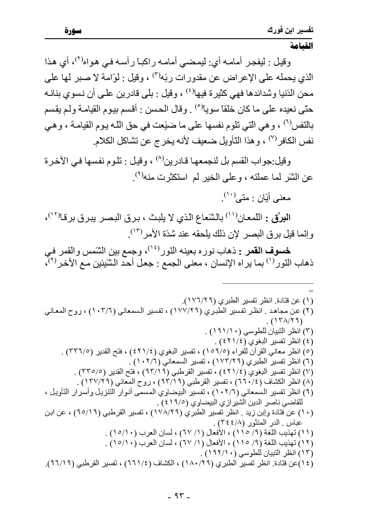 وقيل: بلى قادرين على أن نسوي بنانه حتّى نعيده على ما كان خلقاً سوياً. وقال الحسن: أقسم بيوم القيامة ولم يقسم بالنّفس، وهي التي تلوم نفسها على ما ضيّعت في حق الله يوم القيامة، وهي نفس الكافر.