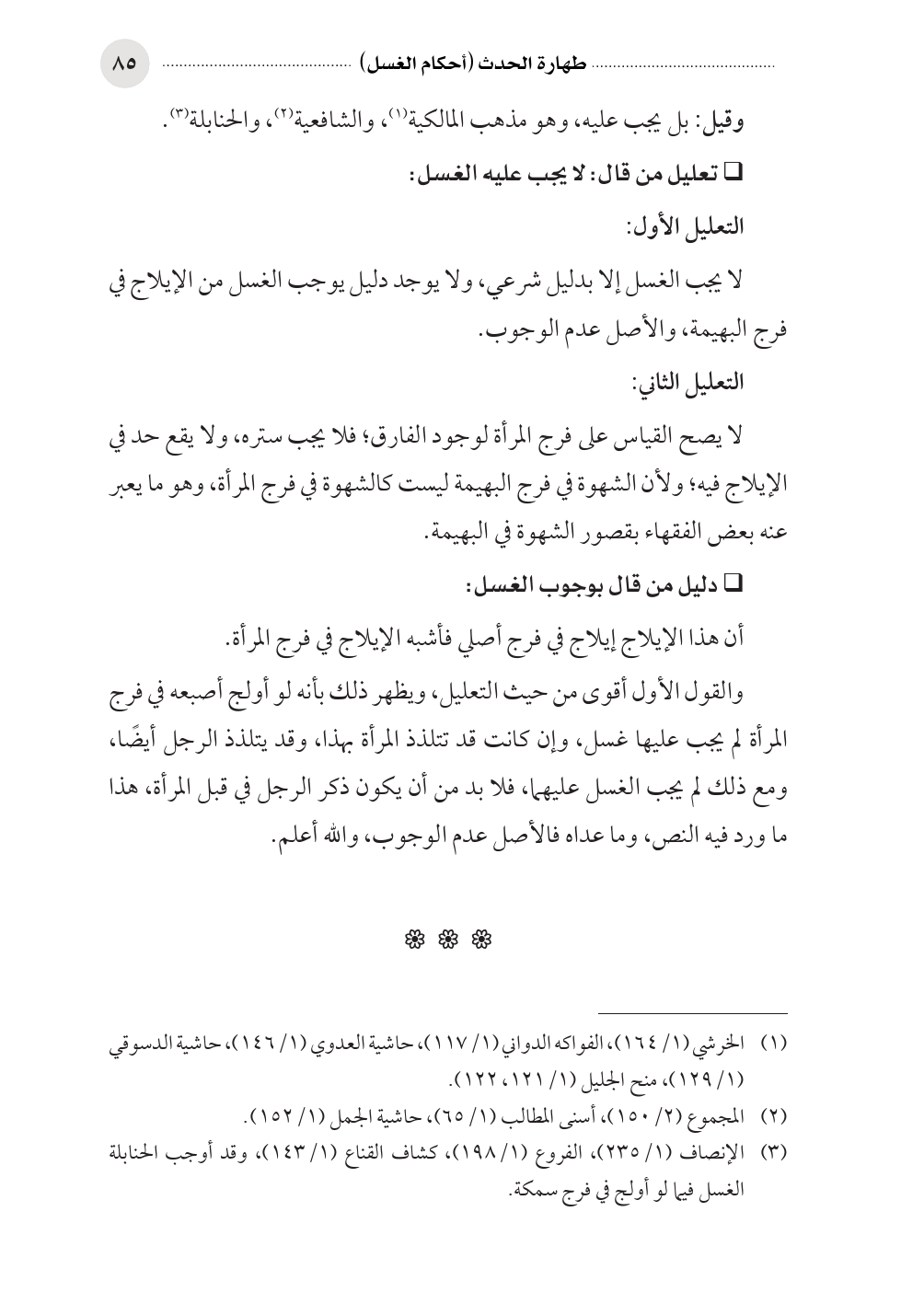 (¬٣) الإنصاف (١/ ٢٣٥)، الفروع (١/ ١٩٨)، كشاف القناع (١/ ١٤٣)، وقد أوجب الحنابلة الغسل فيما لو أولج في فرج سمكة.