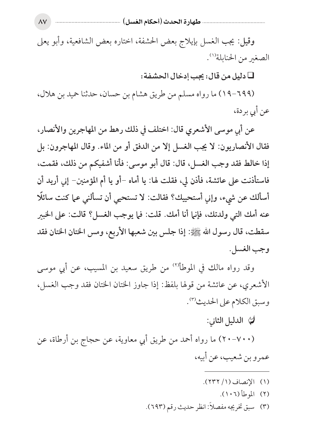 عن أبي موسى الأشعري قال: اختلف في ذلك رهط من المهاجرين والأنصار، فقال الأنصاريون: لا يجب الغسل إلا من الدفق أو من الماء. وقال المهاجرون: بل إذا خالط فقد وجب الغسل، قال: قال أبو موسى: فأنا أشفيكم من ذلك، فقمت، فاستأذنت على عائشة، فأذن لي، فقلت لها: يا أماه -أو يا أم المؤمنين- إني أريد أن أسألك عن شيء، وإني أستحييك؟ فقالت: لا تستحيي أن تسألني عما كنت سائلًا عنه أمك التي ولدتك، فإنما أنا أمك. قلت: فما يوجب الغسل؟ قالت: على الخبير سقطت، قال رسول الله صلى الله عليه وسلم: إذا جلس بين شعبها الأربع، ومس الختان الختان فقد وجب الغسل.
