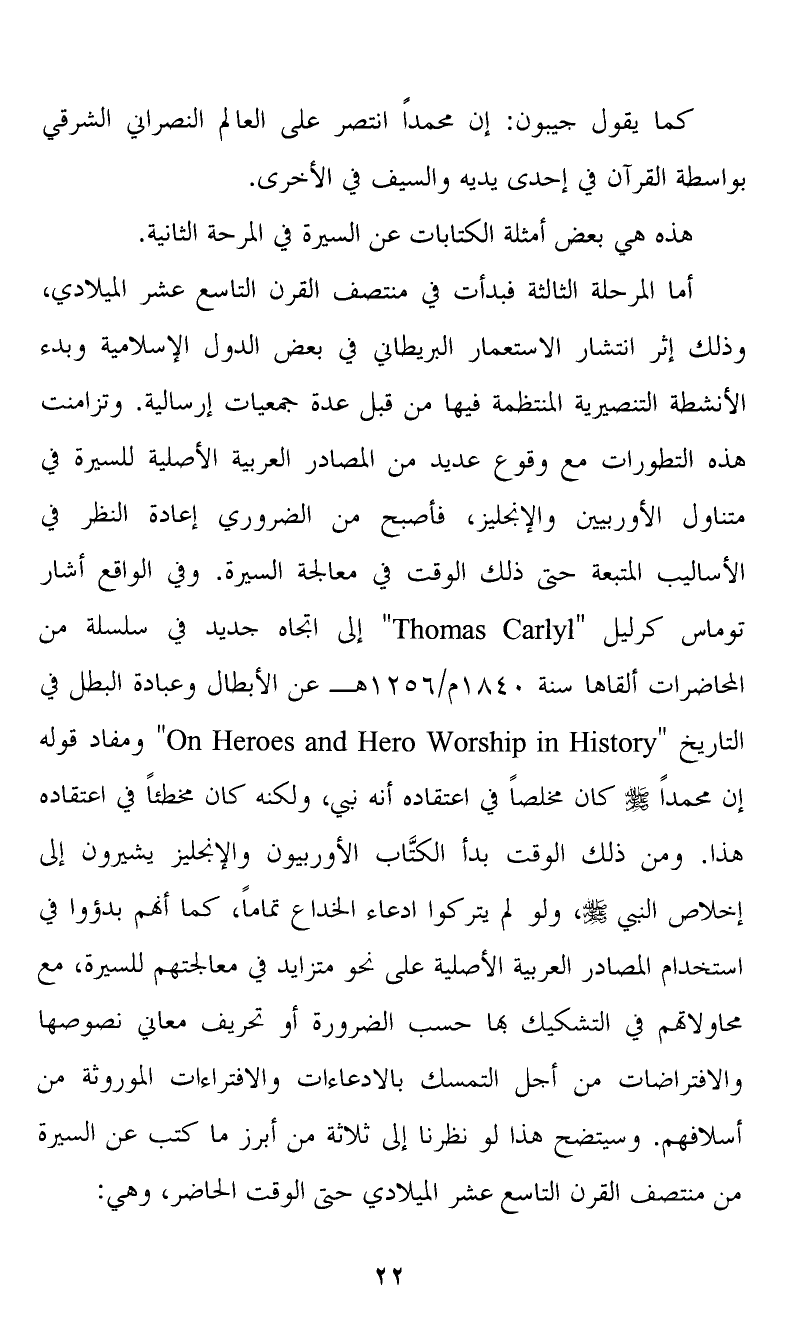 أما المرحلة الثالثة فبدأت في منتصف القرن التاسع عشر الميلادي، وذلك إثر انتشار الاستعمار البريطاني في بعض الدول الإسلامية وبدء الأنشطة التنصيرية المنتظمة فيها من قبل عدة جمعيات إرسالية. وتزامنت هذه التطورات مع وقوع عديد من المصادر العربية الأصلية للسيرة في متناول الأوربيين والإنجليز، فأصبح من الضروري إعادة النظر في الأساليب المتبعة حتى ذلك الوقت في معالجة السيرة. وفي الواقع أشار توماس كرليل "Thomas Carlyl" إلى اتجاه جديد في سلسلة من المحاضرات ألقاها سنة 1840م/1256هـ عن الأبطال وعبادة البطل في التاريخ "On Heroes and Hero Worship in History" ومفاد قوله إن محمداً صلى الله عليه وسلمكان مخلصاً في اعتقاده أنه نبي، ولكنه كان مخطئاً في اعتقاده هذا. ومن ذلك الوقت بدأ الكتَّاب الأوربيون والإنجليز يشيرون إلى إخلاص النبي صلى الله عليه وسلم، ولو لم يتركوا ادعاء الخداع تماماً، كما أنهم بدؤوا في استخدام المصادر العربية الأصلية على نحو متزايد في معالجتهم للسيرة، مع محاولاتهم في التشكيك بها حسب الضرورة أو تحريف معاني نصوصها والافتراضات من أجل التمسك بالادعاءات والافتراءات الموروثة من أسلافهم. وسيتضح هذا لو نظرنا إلى ثلاثة من أبرز ما كتب عن السيرة من منتصف القرن التاسع عشر الميلادي حتى الوقت الحاضر، وهي: