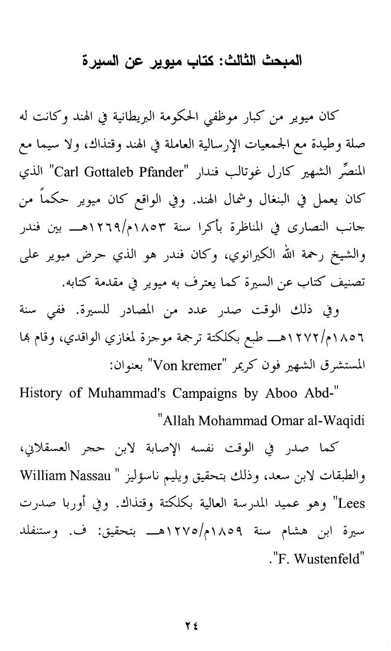 وفي ذلك الوقت صدر عدد من المصادر للسيرة. ففي سنة 1856م/1272هـ طبع بكلكتة ترجمة موجزة لمغازي الواقدي، وقام بها المستشرق الشهير فون كريمر "Von kremer" بعنوان: